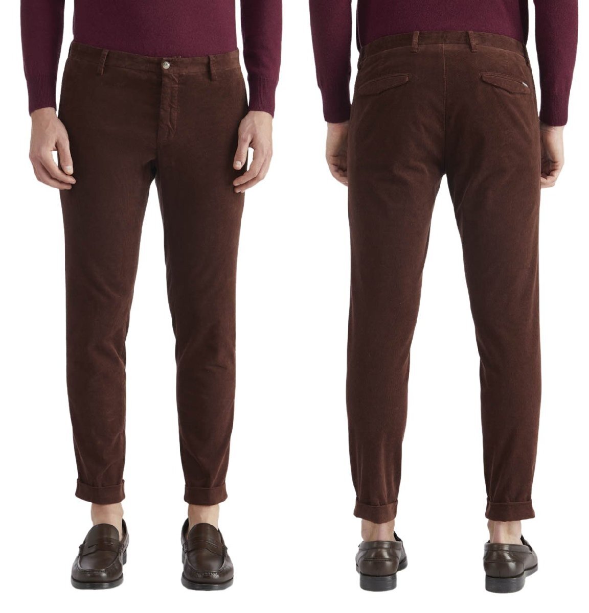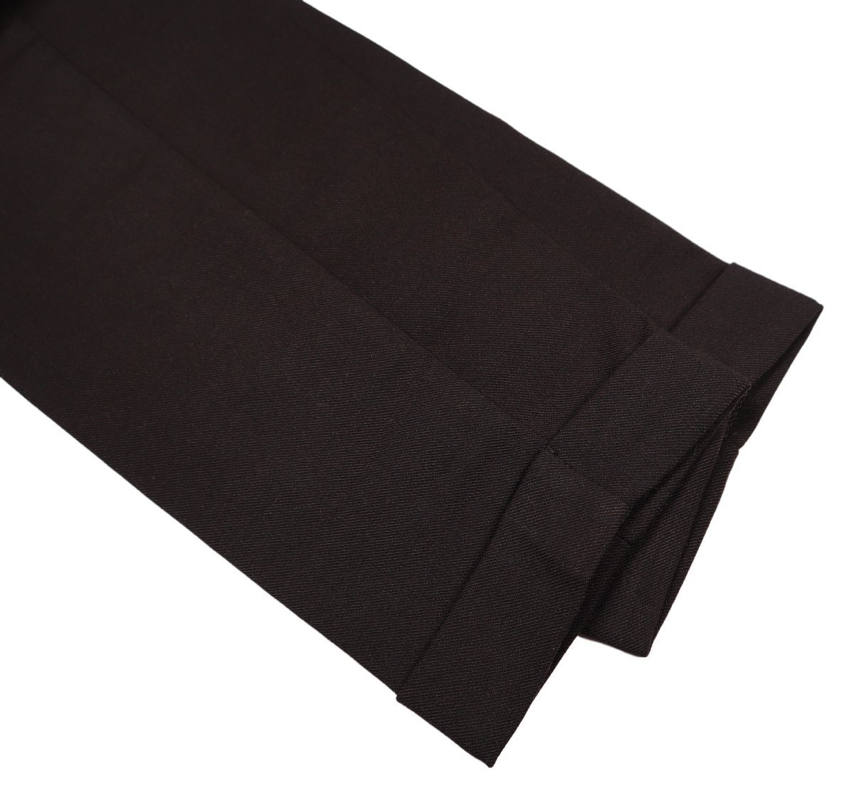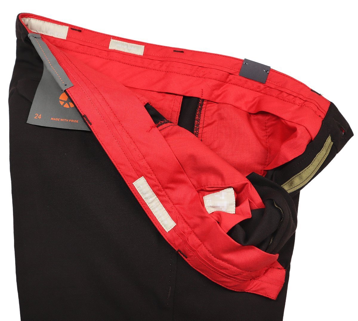 ダークブラウンベースにブラウンの糸を斜めに入れた、上品なチャコールブラウン色。かるく起毛したナイロン・ウール・レーヨン・ポリウレタンを混紡したジャージー素材を使用しようしています。ラインニングの鮮やかなレッド色も色気があり、ハンドステッチも上質感があります。