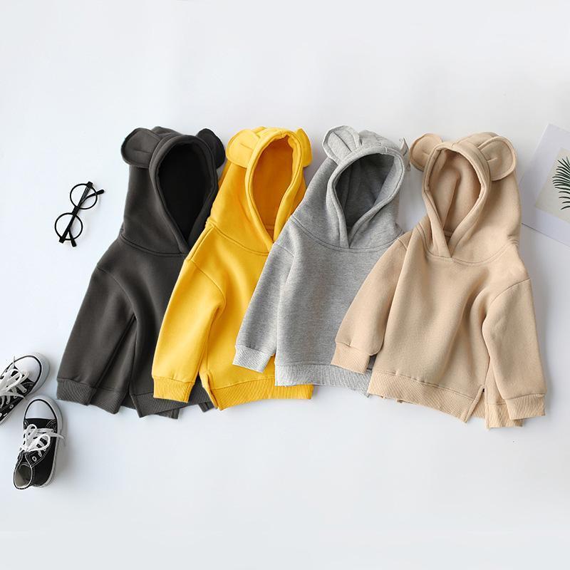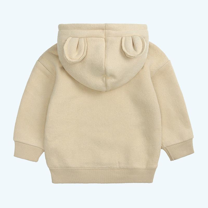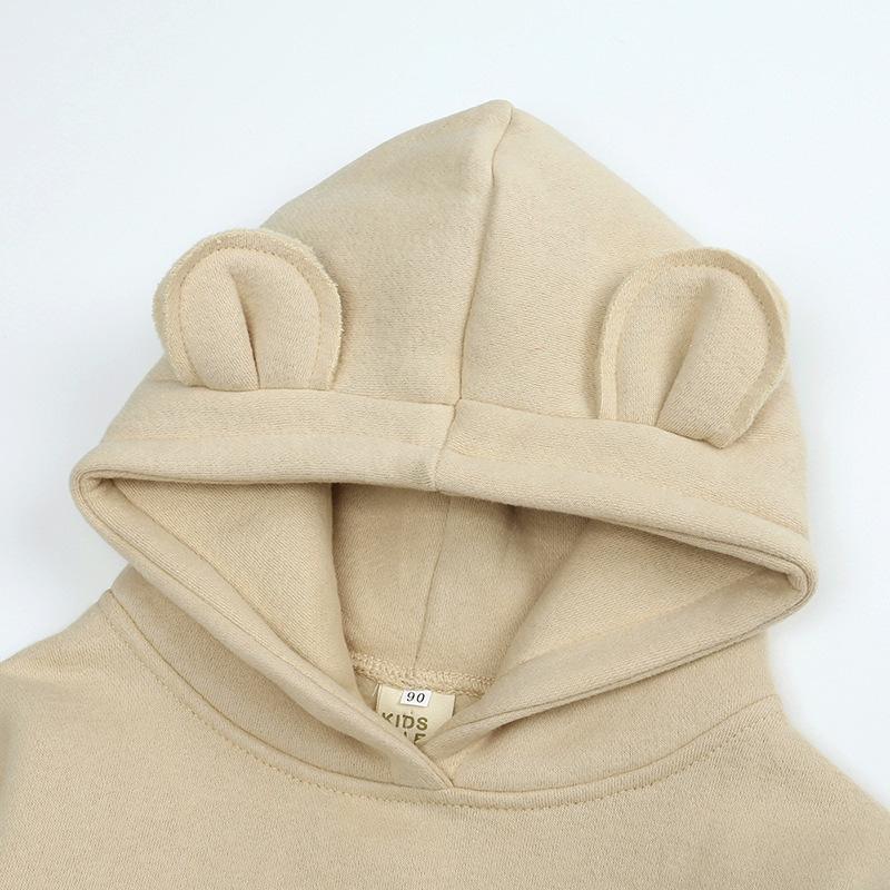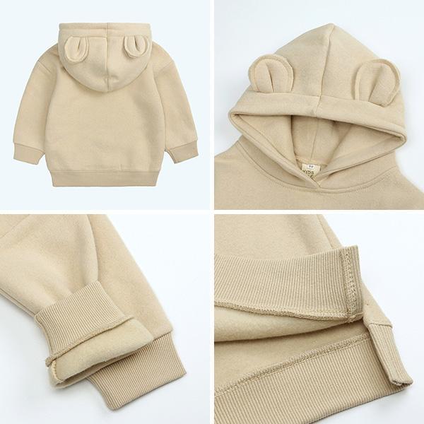 耳付きがかわいいフード付きトレーナーです。しっかりとした中厚手の生地&裏起毛なので秋冬~春先におすすめ♪シンプルなので男の子も女の子も着用でき、兄妹姉妹、双子ちゃん、お友達同士で合わせてもとてもカワイイと思います♪また、ミッキーやプーさん、ダッフィー風のコスプレにもおすすめなのでハロウィンやディズニーに行くときにもいかがでしょうか( )