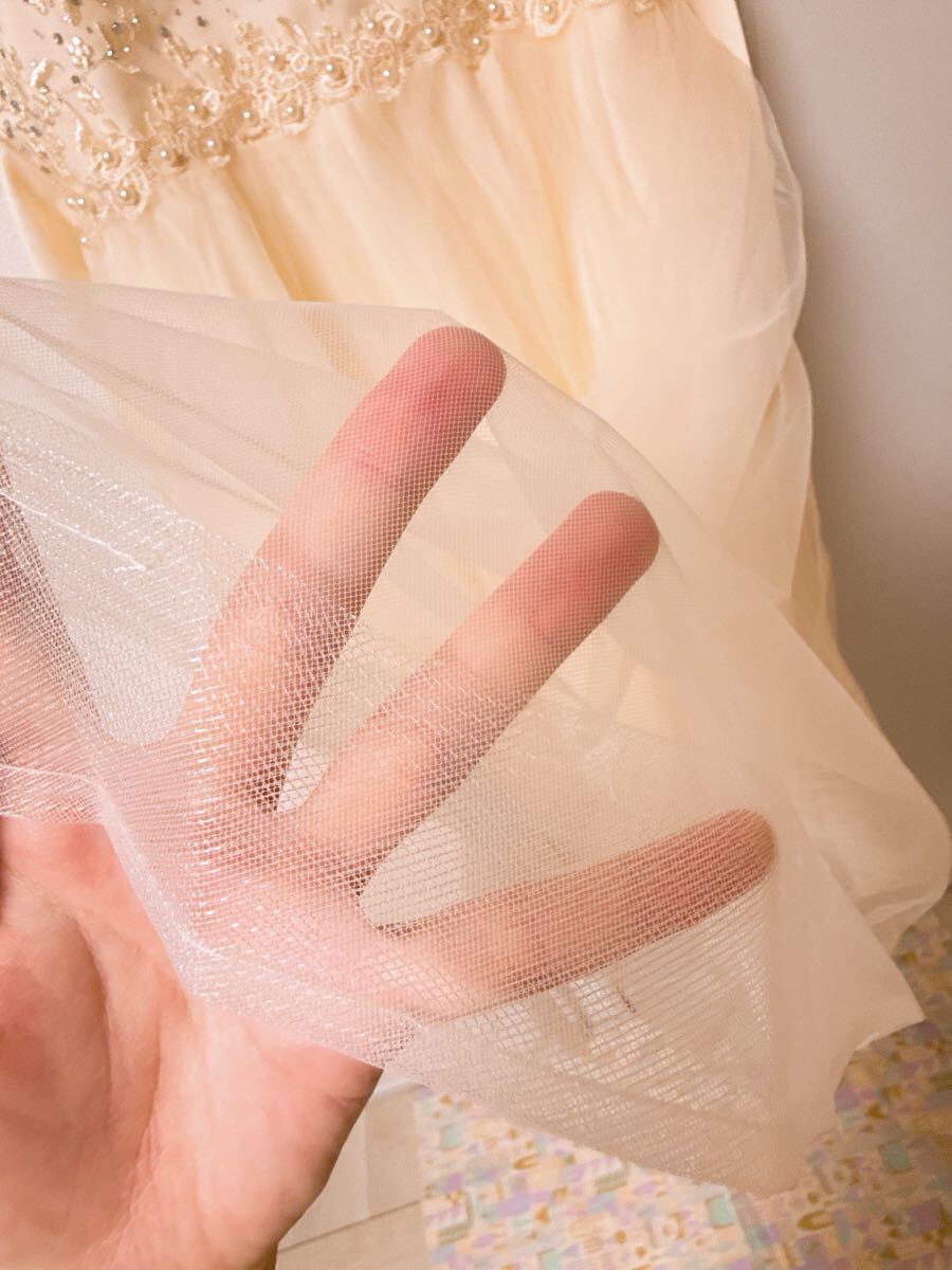 生地は3枚で、元々は白い生地の外側にチュールが付いていましたがボリュームが出過ぎてしまったため外しています。また、裾にハードチュールが付いていますが一部糸が取れている箇所があります(故意に外そうとしない限りこれ以上広がることはないかと思います)。