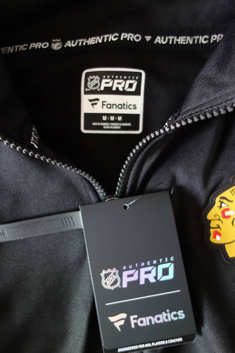 ブラックホークスのジャケット、選手着用モデル(オーセンティックプロ)です。ファナティクス社製、サイズ:M(身幅約53cm、着丈約76cm)、色:ブラック、新品未使用タグ付きです。