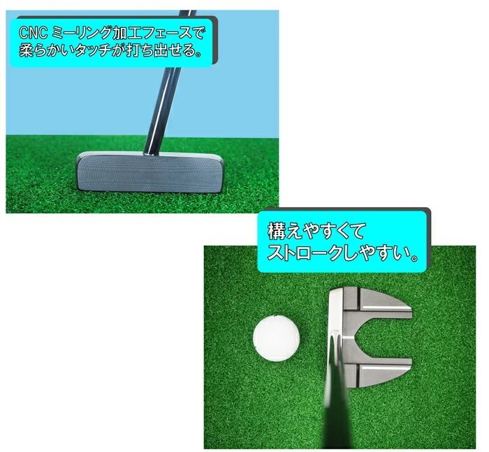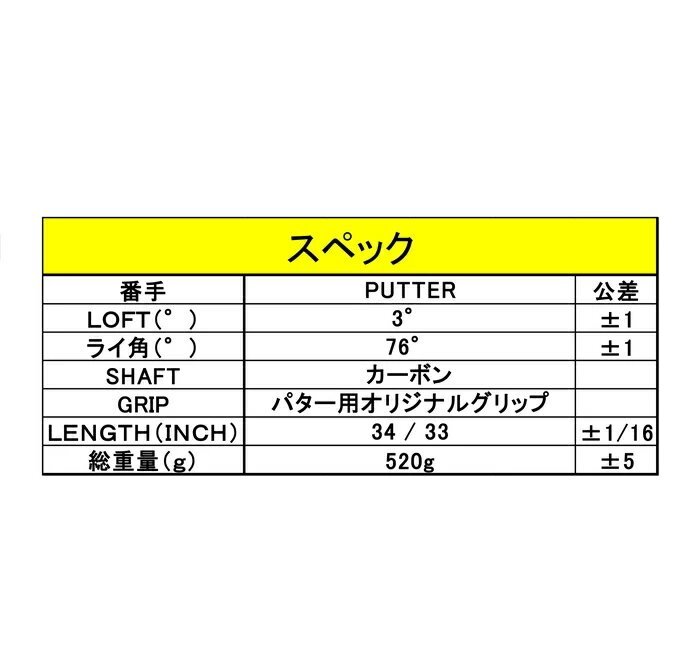 仕様 | ◇ロフト角:3度 ◇ライ角:76度 ◇長さ:34インチ ◇総重量:約520g ◇シャフト:専用カーボンシャフト ◇グリップ:パター用オリジナルグリップ ◇付属品:専用ヘッドカバー |