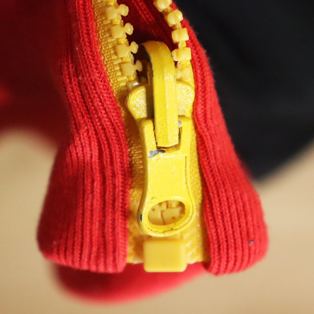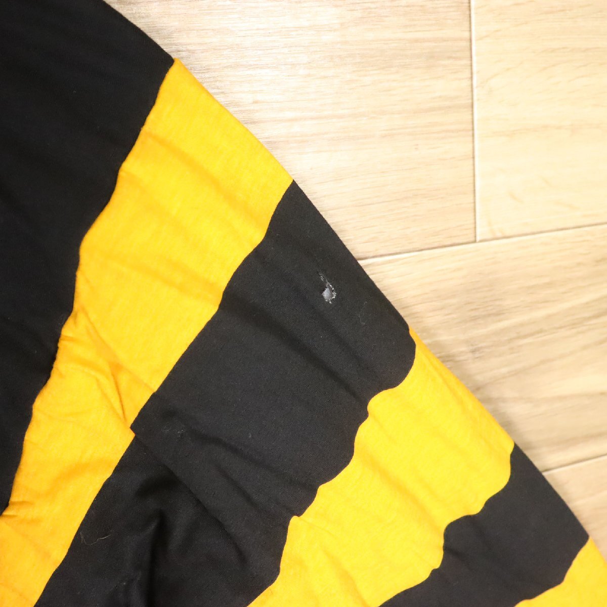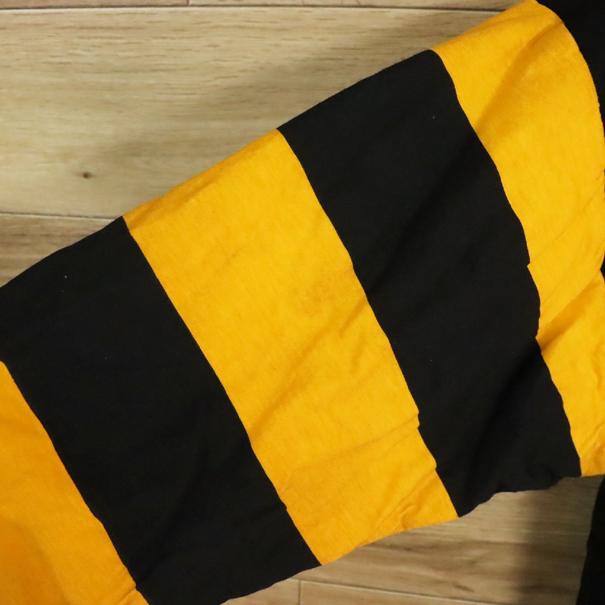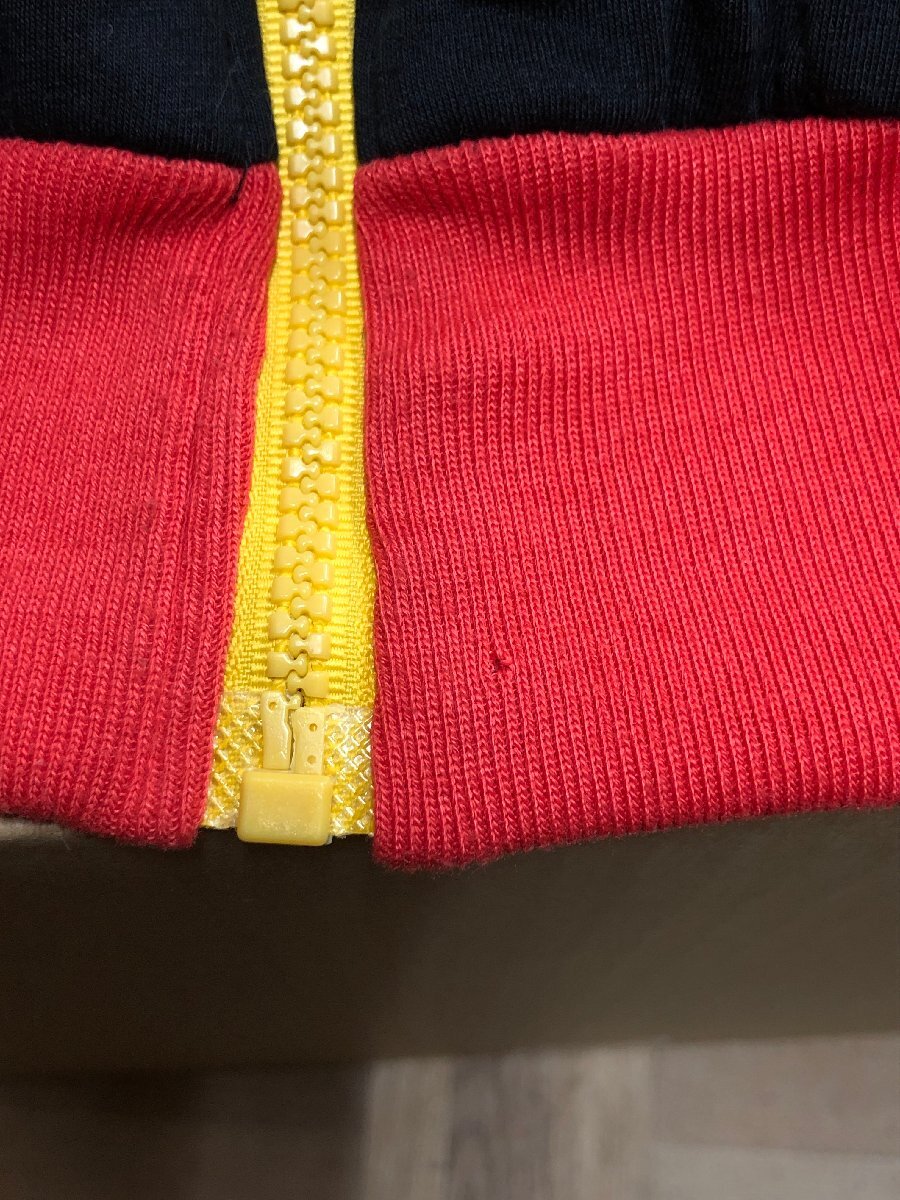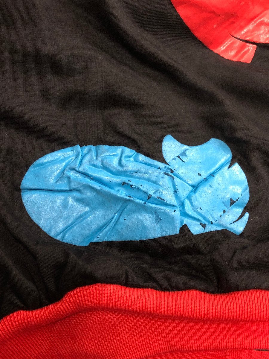 中古品です。使用感があります。両腕と右ポケットに薄汚れ、裾リブに小さいホツレ、左腕に小さい破れ、プリント路着に剥げと縮み、タグに切り取りがあります。