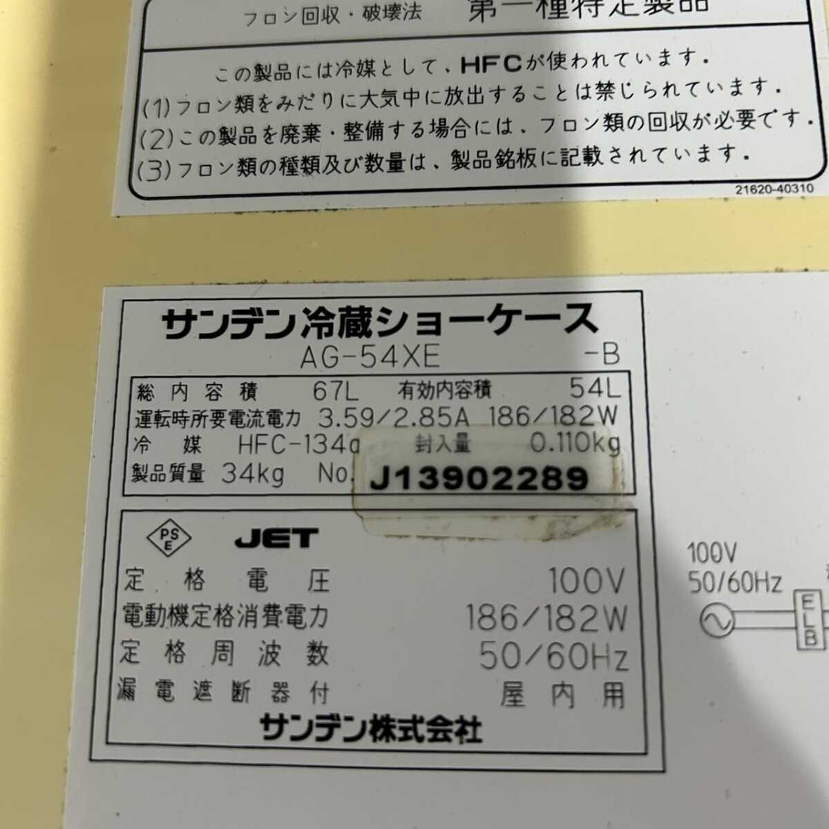 サンデン AG-54XE 卓上型 冷蔵ショーケース 2014年製 前後扉 冷蔵庫 業務用 店舗用品 動作確認済み