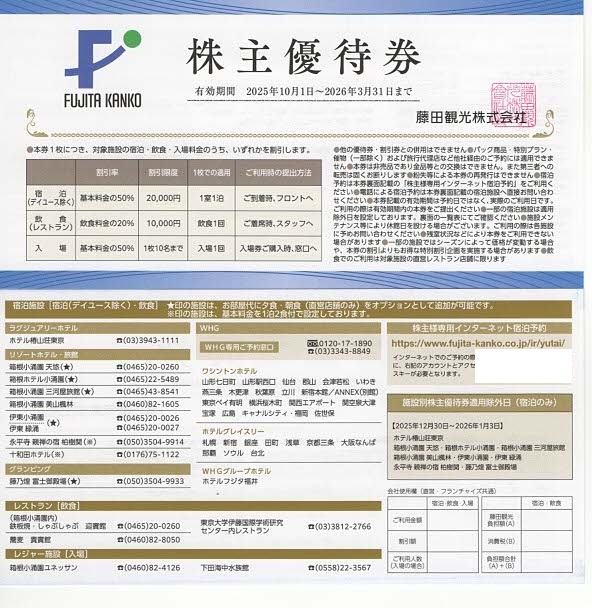 藤田観光 株主優待券(宿泊・飲食等割引) ワシントンホテルなど1枚 2026年3月31日までb