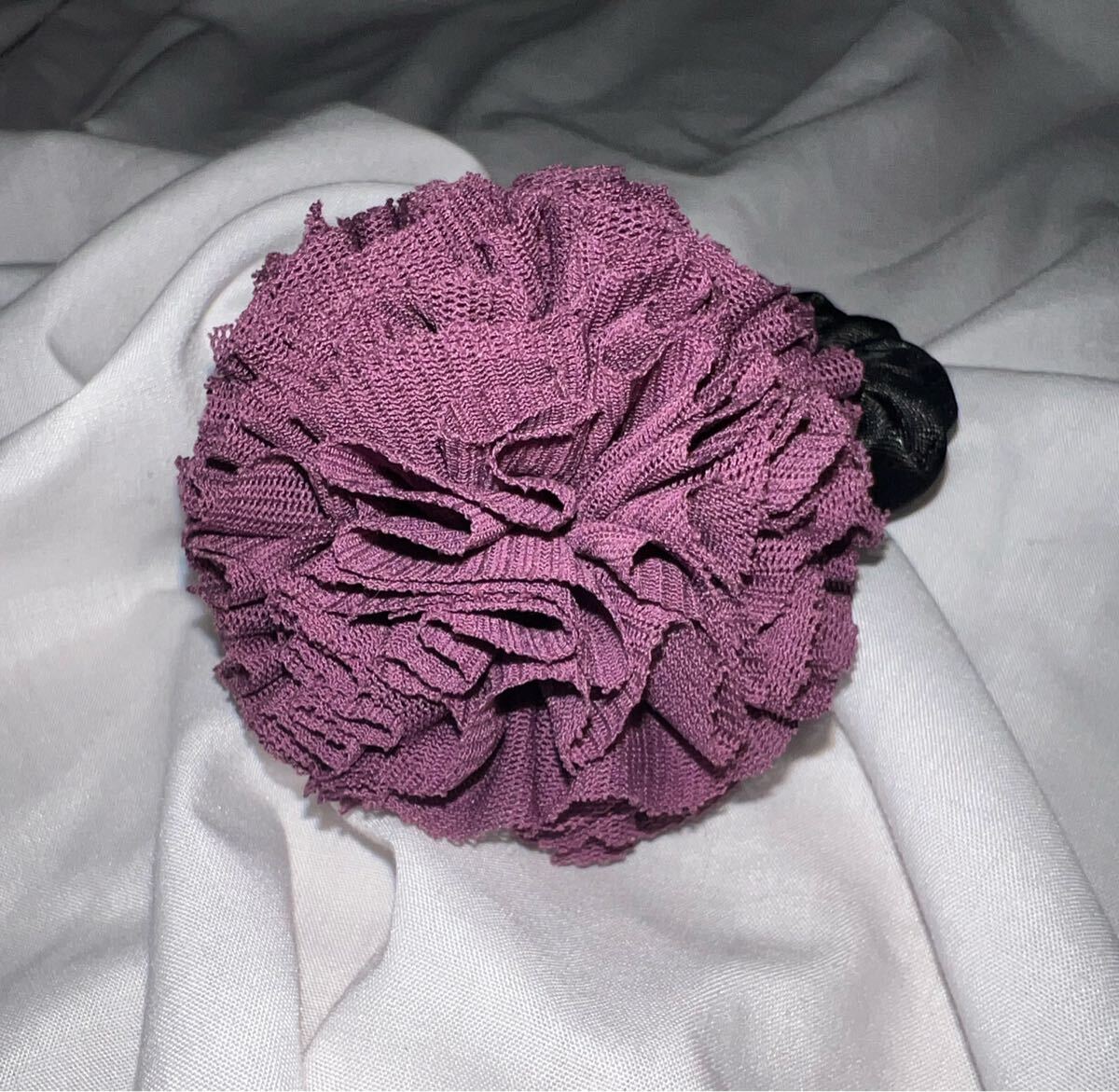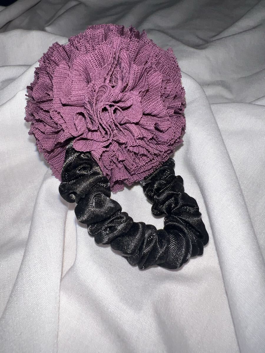 大ぶりのフリルフラワーが目を引く、ブラック×パープルの大人可愛いシュシュです