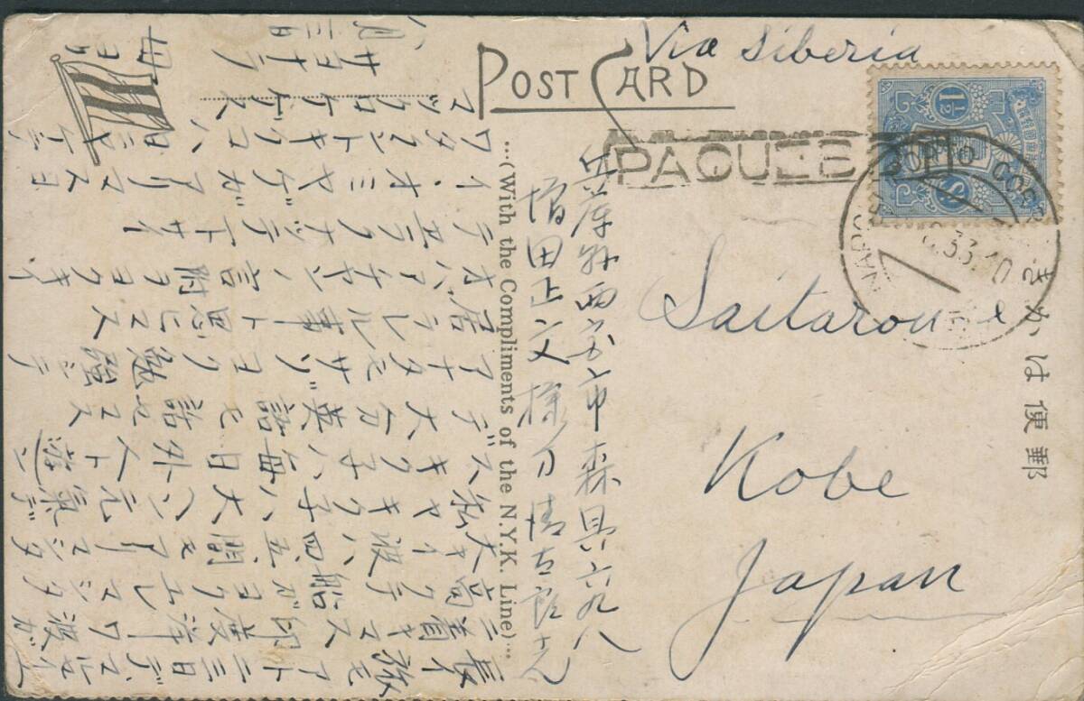 〇パックボウ ナポリ「PAQUEBOT」+NAPOLI POROTO1933.8.5→西宮 郵船絵はがき 新毛