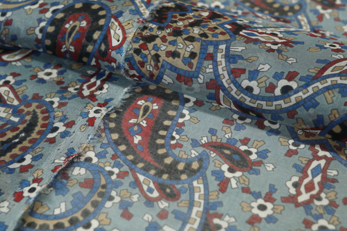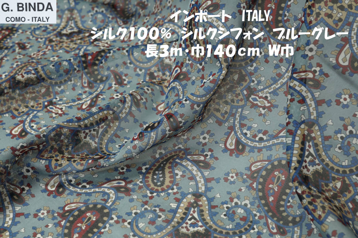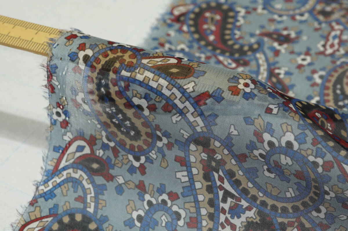 シルク100%、薄地、ソフト系、シルク独特のキシキシとした手触り、透け感、ひらひらドレープ感、色調:ブルーグレー系ベースの多色ペイズリー・花柄?モチーフでございます。