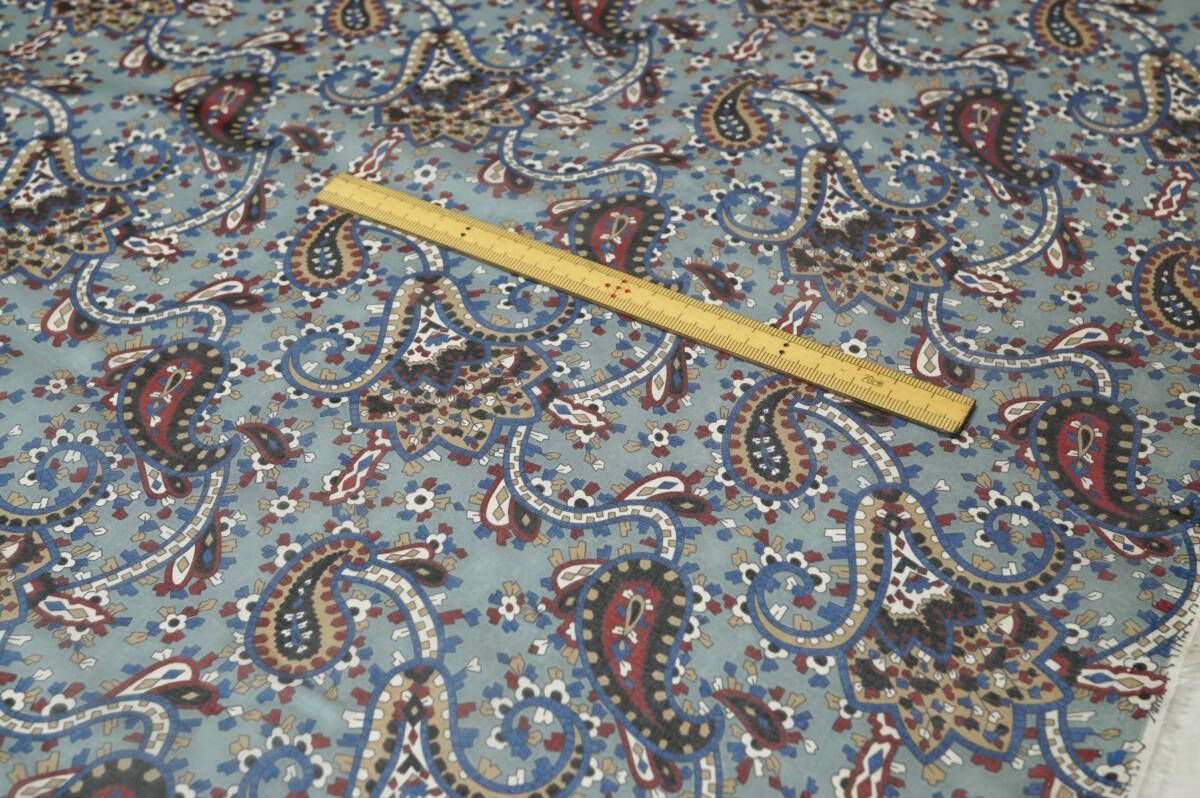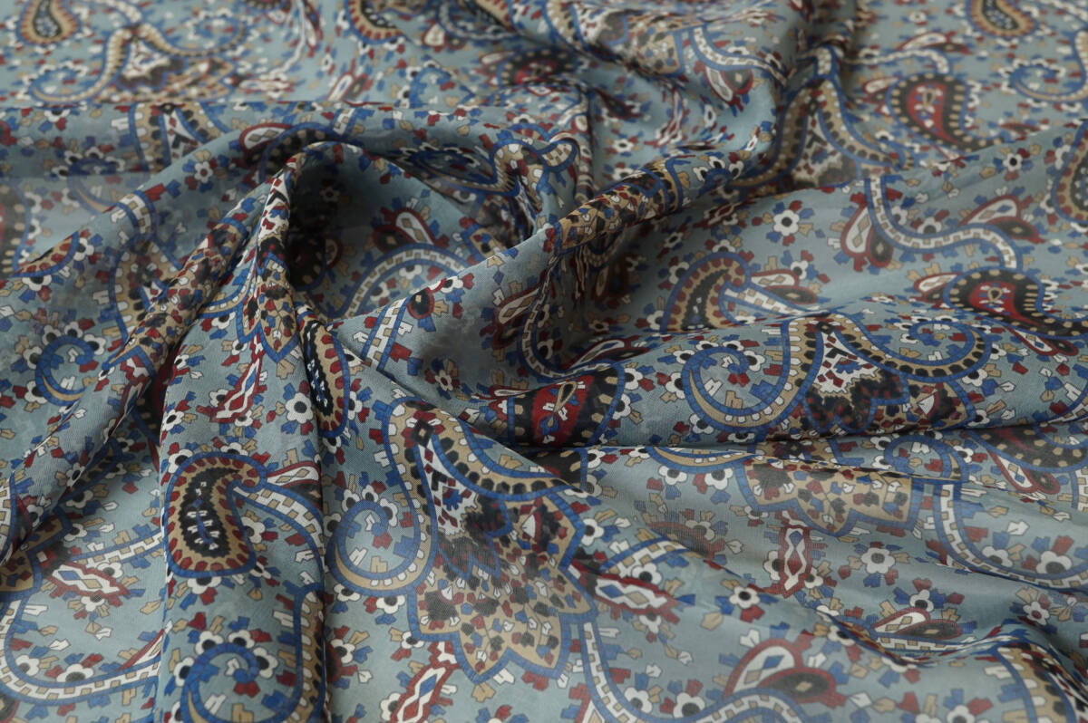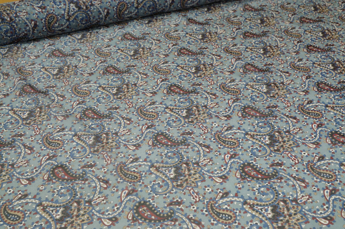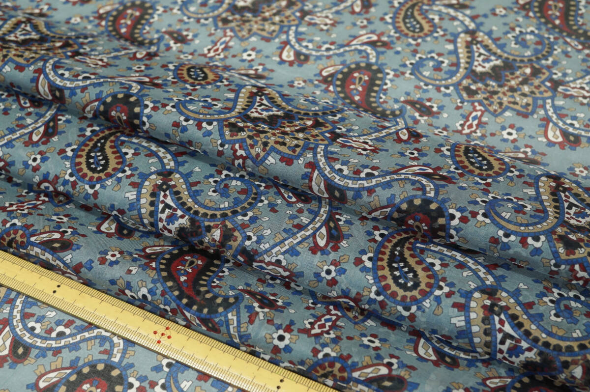 シルク100%、薄地、ソフト系、シルク独特のキシキシとした手触り、透け感、ひらひらドレープ感、色調:ブルーグレー系ベースの多色ペイズリー・花柄?モチーフでございます。