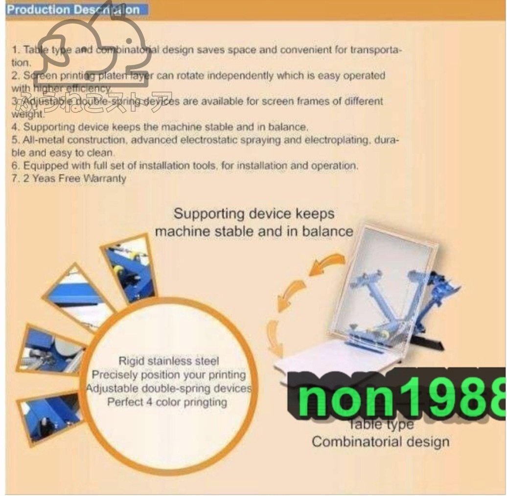 商品詳細 ●商品未使用 ●状態:新品未使用 商品名:シルクスクリーン印刷機 4色 4ステーション Tシャツ 業務用 家庭 DIY ハンドクラフト NS404 ※入金確認後、30日以内に到着 モデル番号:NS404 材料:ステンレス鋼 カラー:4色 ステーション:4 station マシンサイズ:800*190*1