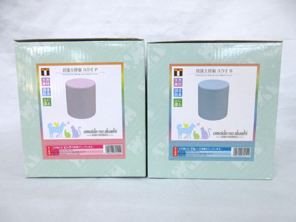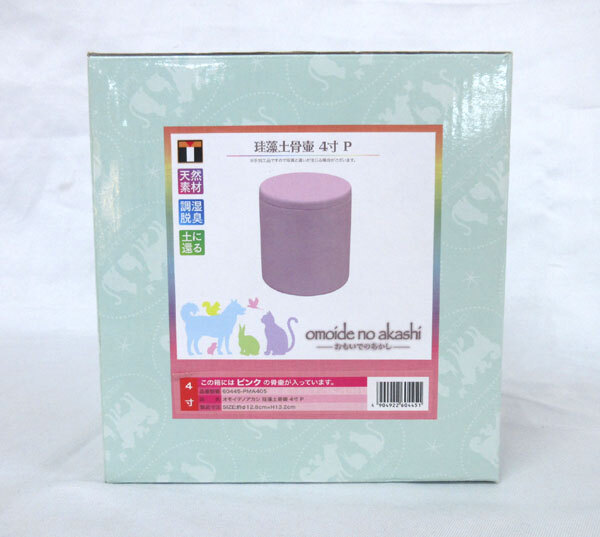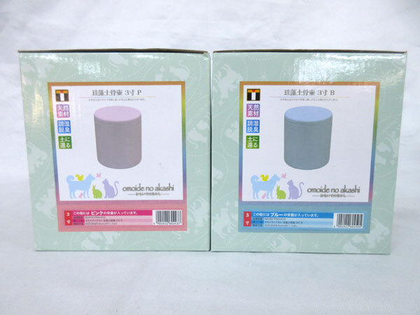 内 容 | ■ペット用 珪藻土骨壺 おもいでのあかし ●3寸(約φ9.5×H11.1cm) ・ブルー×1点 ・ピンク×1点 ●3.5寸(約φ11×H11.8cm) ・ブルー×2点 ・ピンク×1点 ●4寸(約φ12.8×H13.2cm) ・ピンク×1点 バスマットなどでおなじみの珪藻土を使用した骨壺です。 通常使用される陶器の骨壺では、 内部にたまった湿気などを放出する事ができませんが 珪藻土は湿気を調整する天然素材ですので、 カビの発生を軽減し、脱臭効果も期待できます。 |