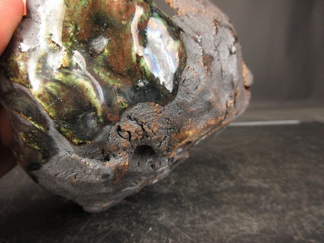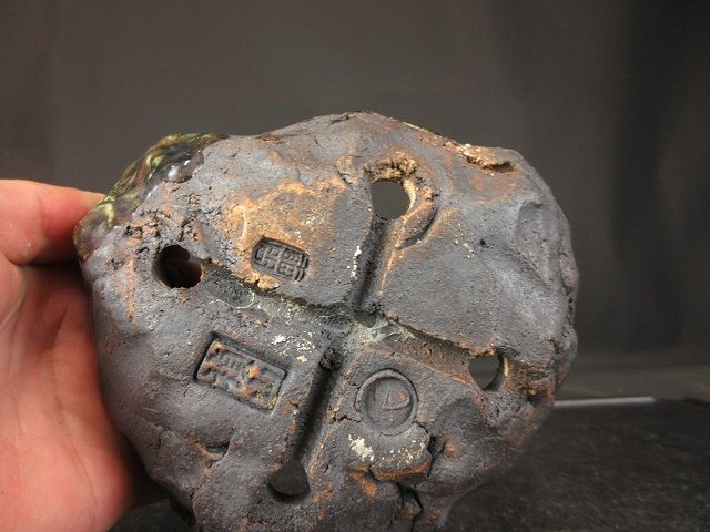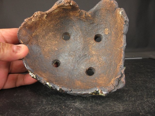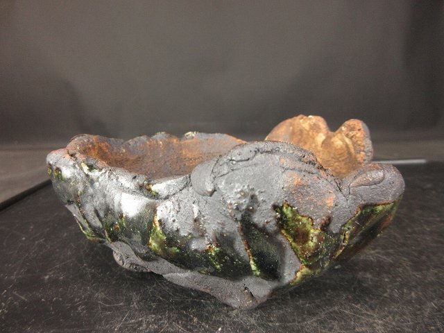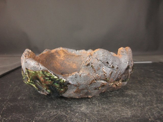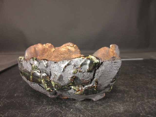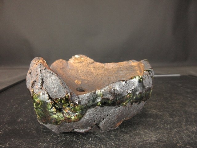 ご覧のような『禎山 緑釉手作り変鉢 (小品、貴風)(人気作家)(盆栽、蘭、草物鉢)』でございます。鑑賞用・使い鉢としていかがでしょうか。