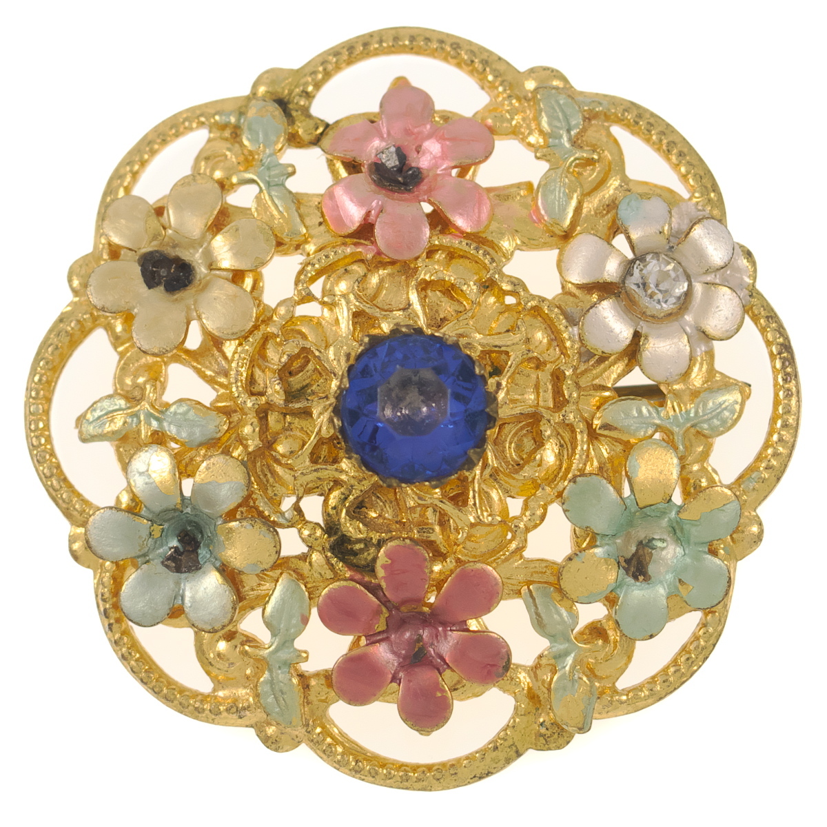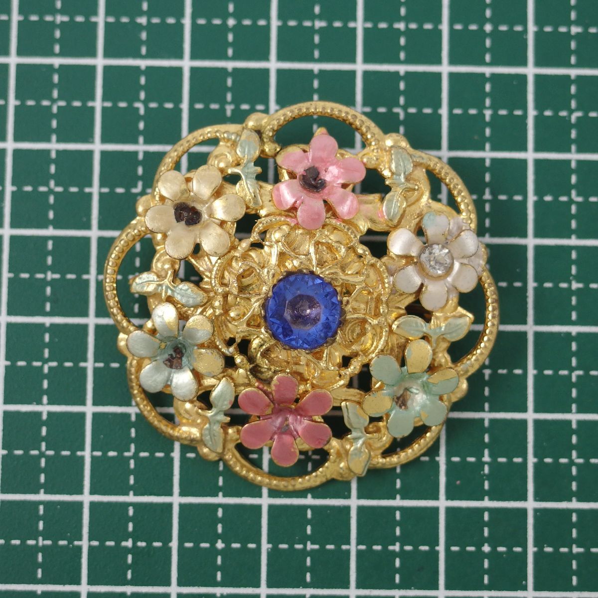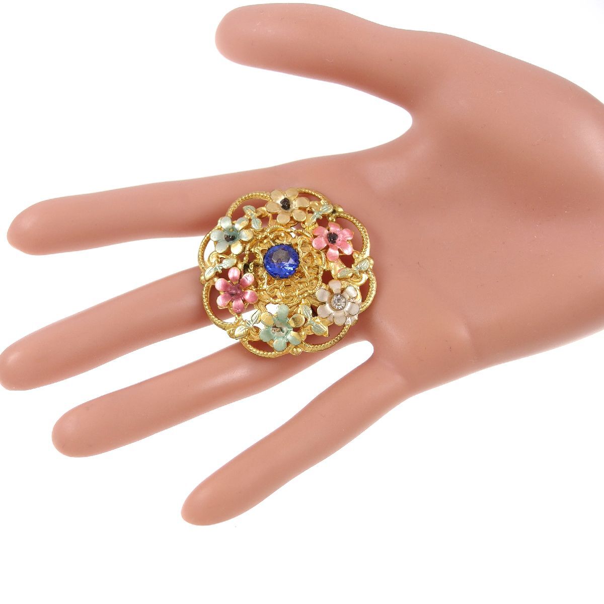 UK4222◆ フラワーモチーフ カラーペイント 六輪の花 ラインストーン イギリス 英国 ◆ ヴィンテージブローチ ◆