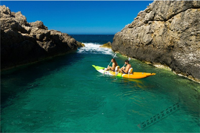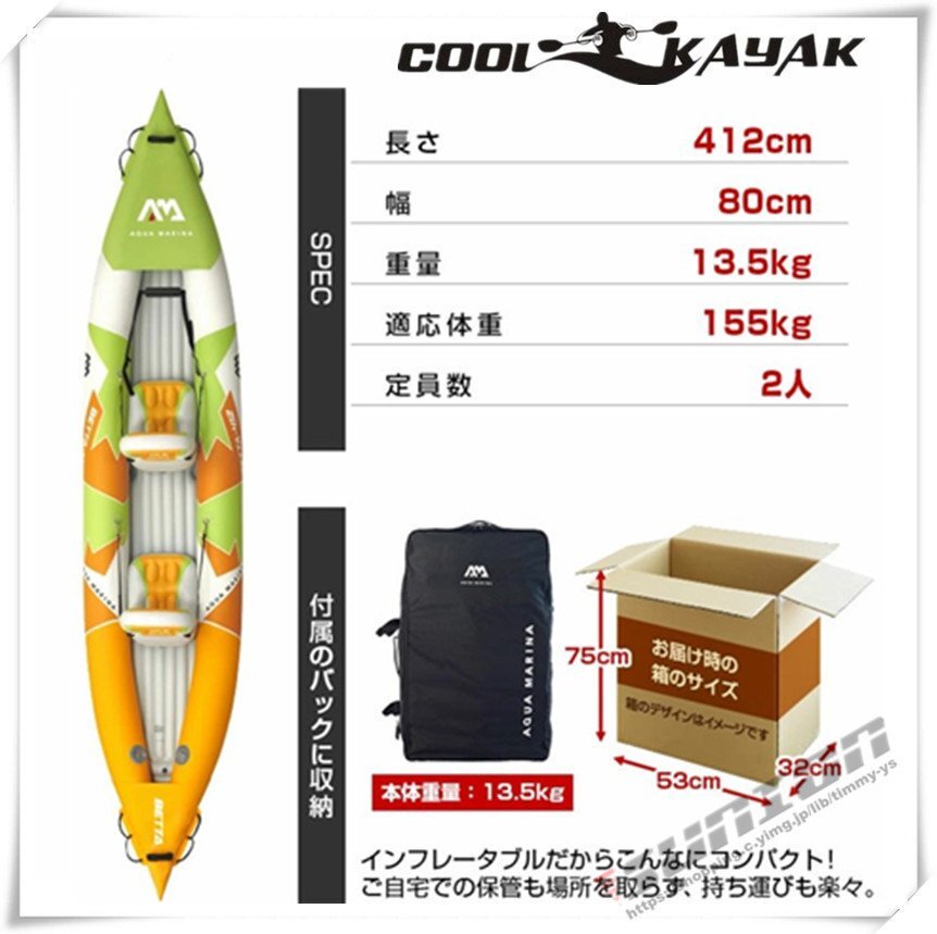 【商品SPEC】■長さ:412cm■幅:80cm■重量:13.5kg■適応体重:155kgまで■セット内容:本体、バッグ、フットポンプ、シート×2、パドル×2、フィン×2●持ち運びや保管に便利な、2人乗りインフレータブル式カヤック。●カヤック本体とイスを膨らませて取り付けるだけの初心者に最適な簡単構造。●角度の調節できるインフレータブルシートにより数時間のパドリングも楽々。●フロアに設置されたドレンバルブにて船体に入った水を排出し、最適な量に調節することが可能です。