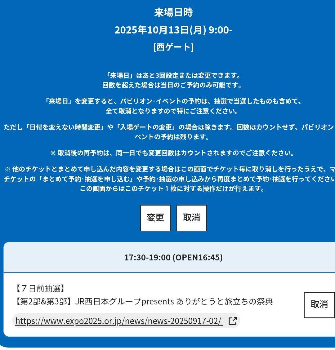 大阪万博 10月13日 9時 西ゲート 1枚 ありがとうと旅立ちの祭典予約済み