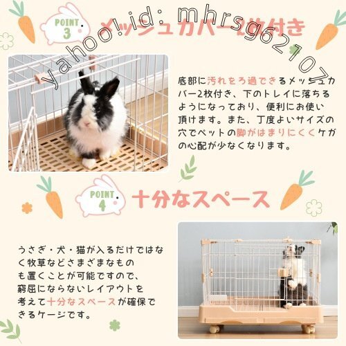 • 【十分なスペース】うさぎ・犬・猫が入るだけではなく牧草などさまざまなものも置くことが可能ですので、窮屈にならないレイアウトを考えて十分なスペースが確保できるケージです。