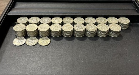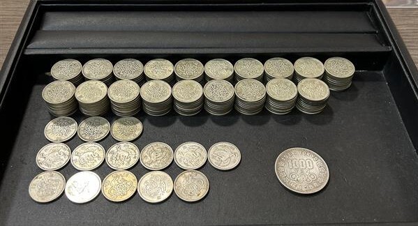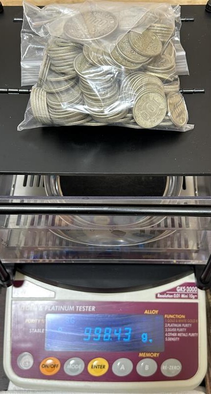 100円銀貨 稲穂193枚、鳳凰6枚、オリンピック5枚、計204枚。1000円銀貨1枚、合計205枚セット。キズ汚れ有、現状渡しです。 | ||