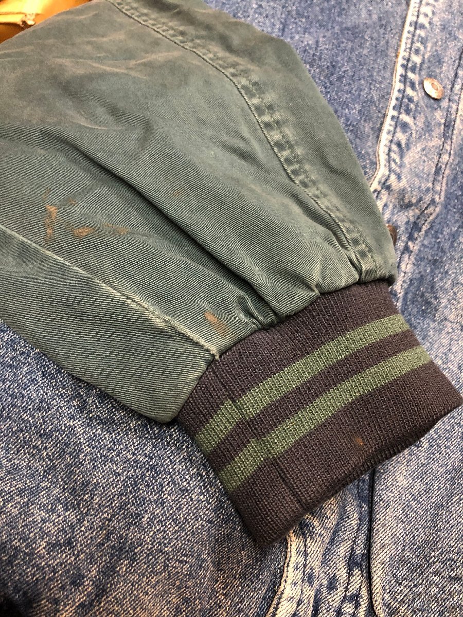 中古品です。使用感があります。右袖と腹部周辺に薄汚れ、左袖裏地にリペア跡がありますが、他に大きなダメージはありません。