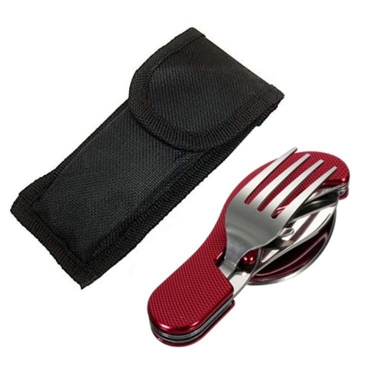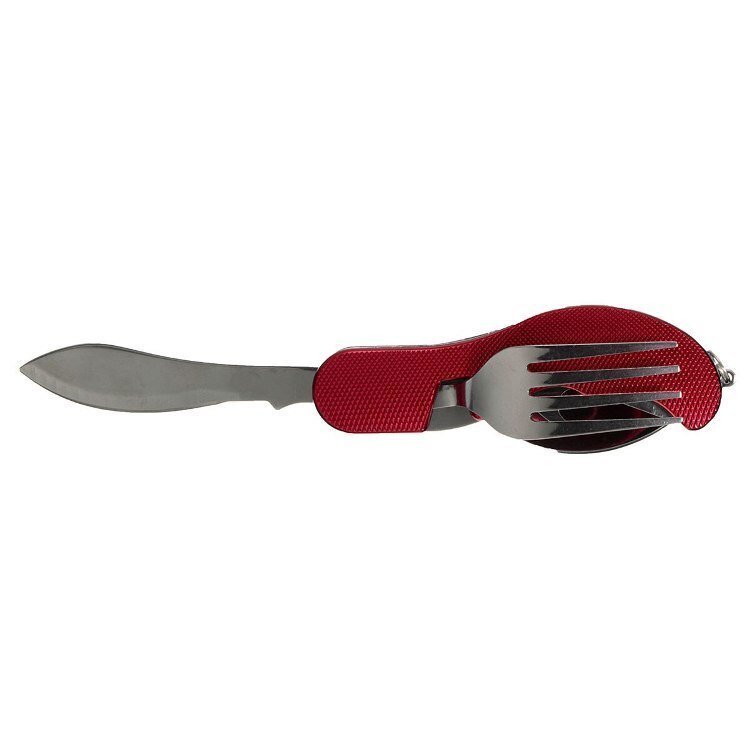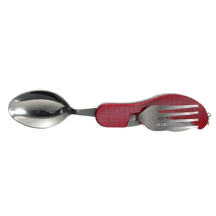 ステンレス製のフォーク スプーン ナイフ 栓抜き が一つになったマルチツール型アウトドア用カトラリーセットです。