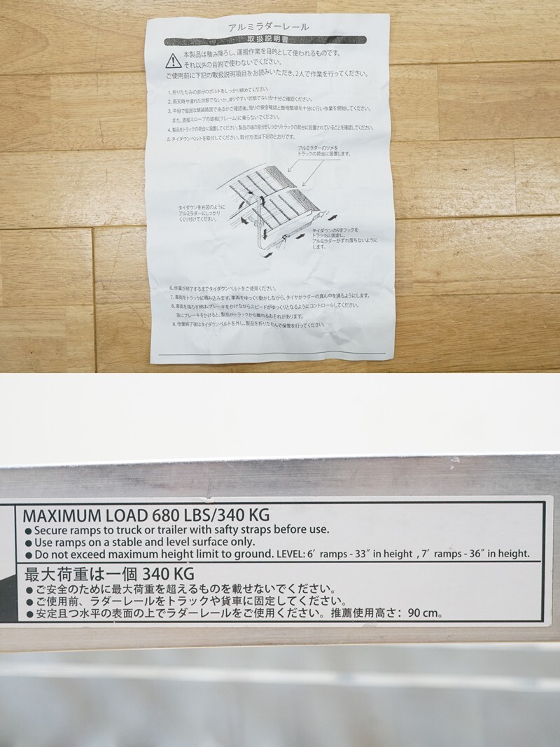 ■前ダ:【アルミブリッジ】アルミラダーレール 2本セット 折りたたみ式 耐荷重340kg ベルト付き 軽量 アルミスロープ ★送料無料★■ ◆最大荷重:1個 340kg ◆推薦使用高さ:90㎝ ◆滑り止め付き ◆折りたたみ式で収納しやすく、省スペース設計なので保管にも便利です。 【サイズ】 ・全体 :(約)幅30.0 ×奥行8.5 ×長さ225.0 ㎝(ハンドル含まず)×2点 ・折りたたみ時:(約)幅115.0 ×奥行15.0 ×高さ29.3 ㎝(ハンドル含まず)×2点 中古のお品となります。 付属品は写真にあるものが全てです。 使用に伴うヨゴレ、キズが複数ございます。 商品画像をよくご確認の上、ご参加ください。 [管理No.前25100304R1] |