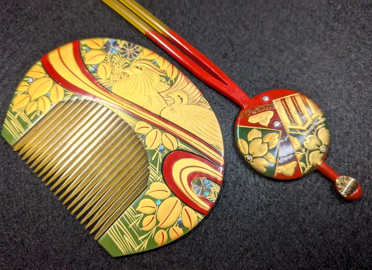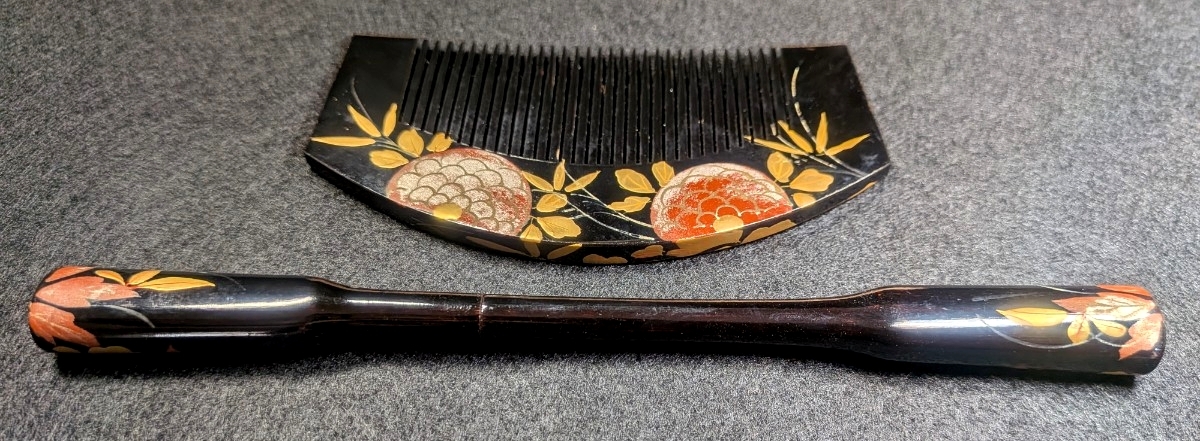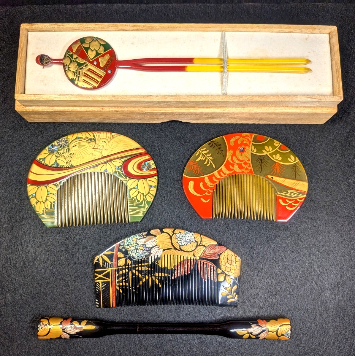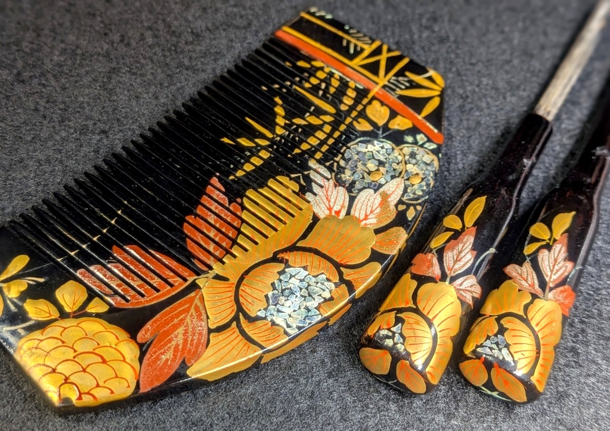蒔絵と螺鈿が素敵な木製の櫛笄セットをまとめて出品させて頂きます。