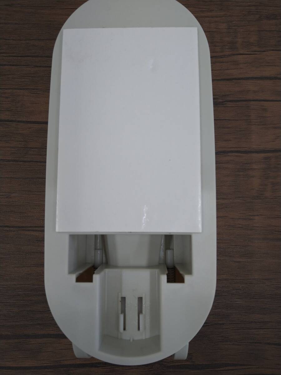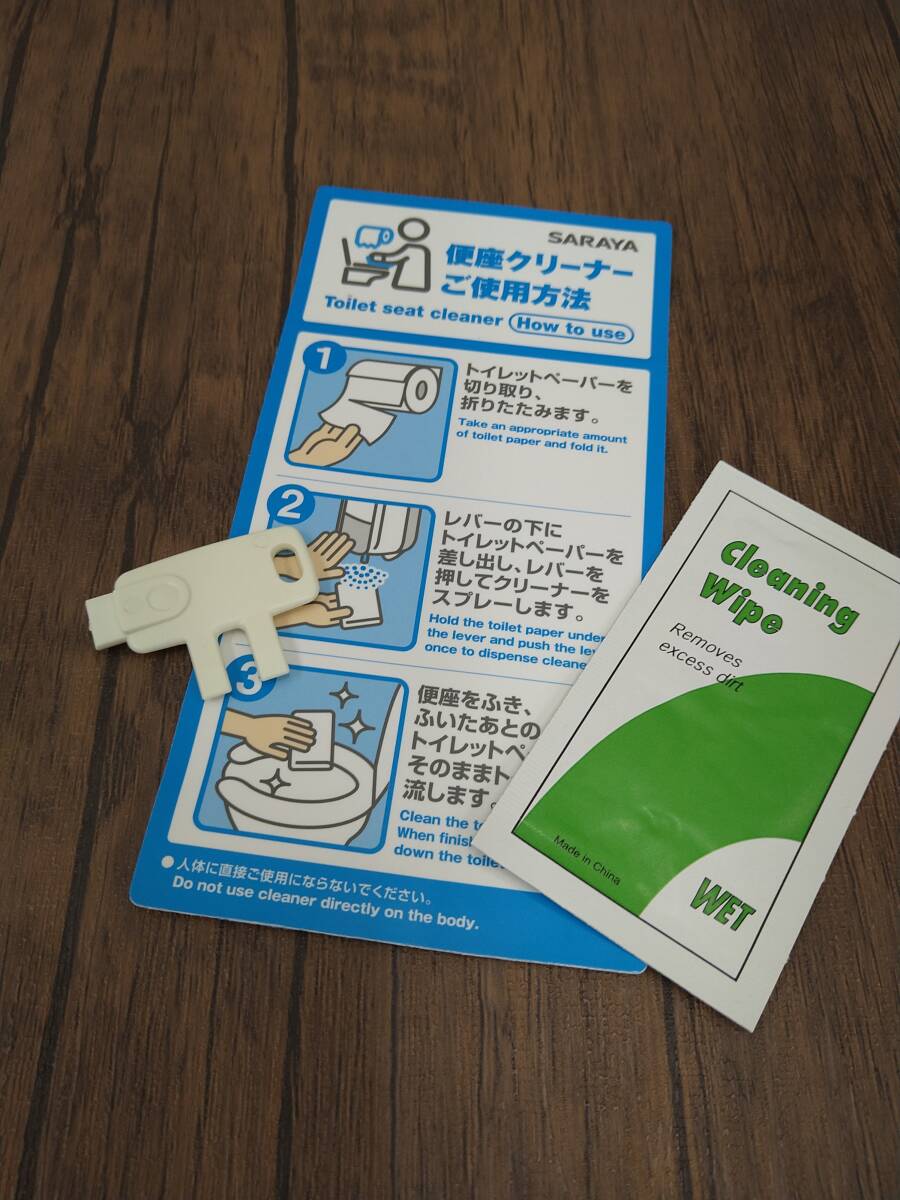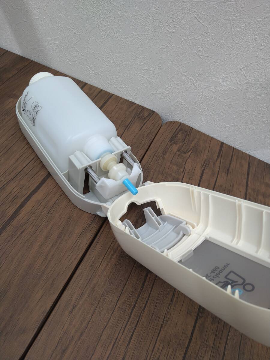 専用の便座クリーナー(別売)を入れて使用する、壁付け型の手押し式ディスペンサーです。
