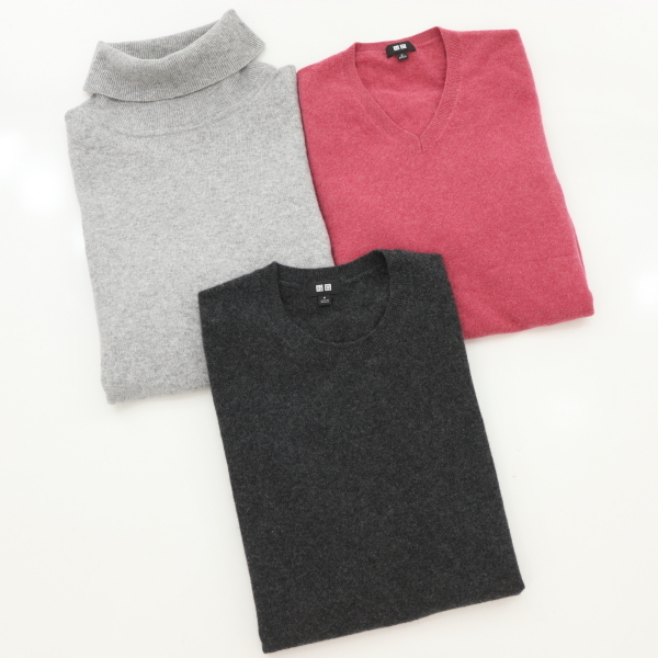 作り、デザインに、定評のある人気ブランド、「UNIQLO」の、カシミヤ100%セーター3枚組になります。