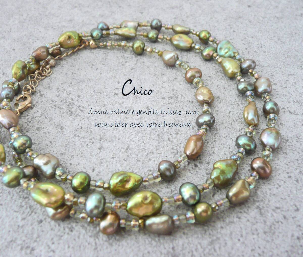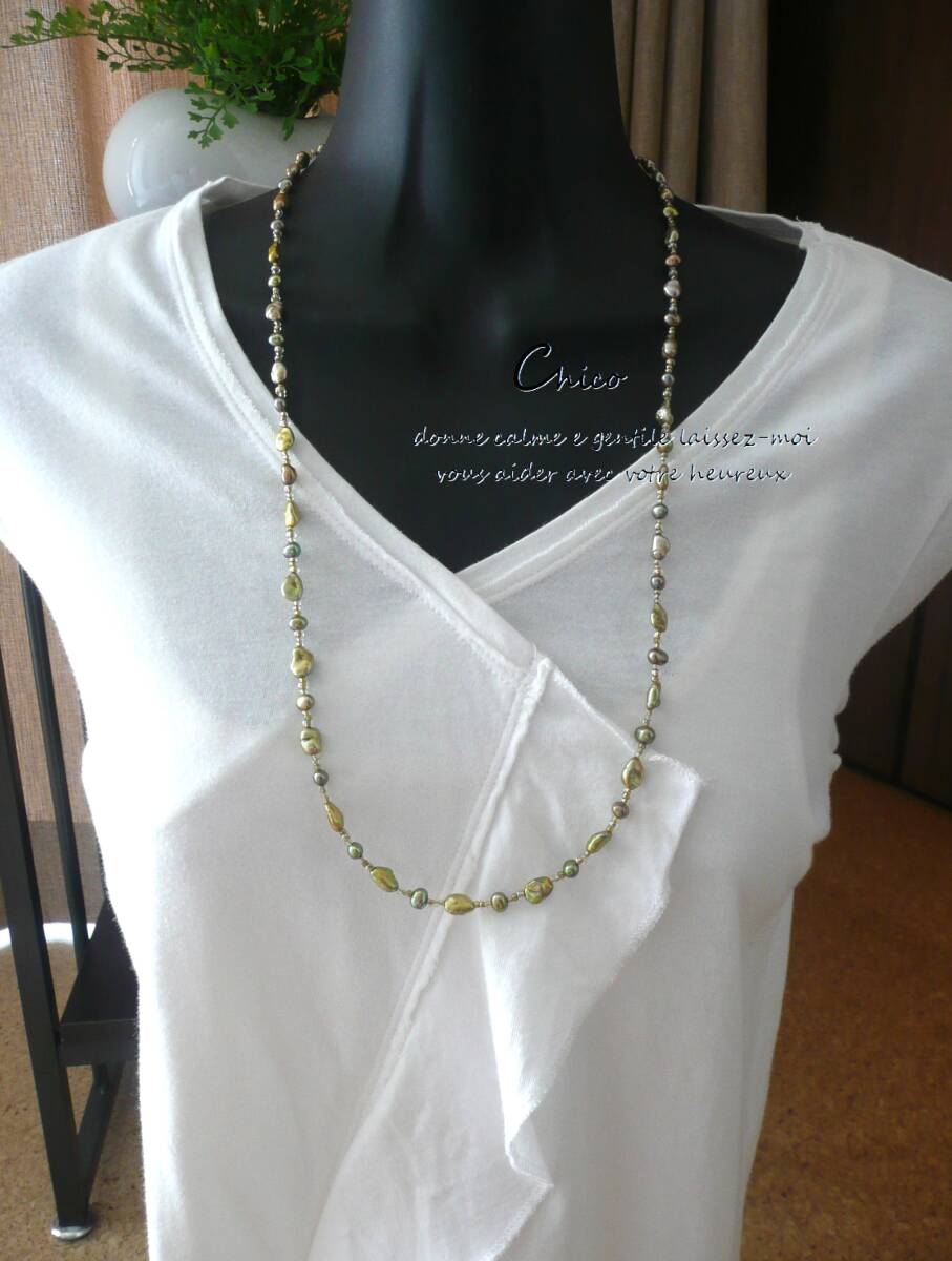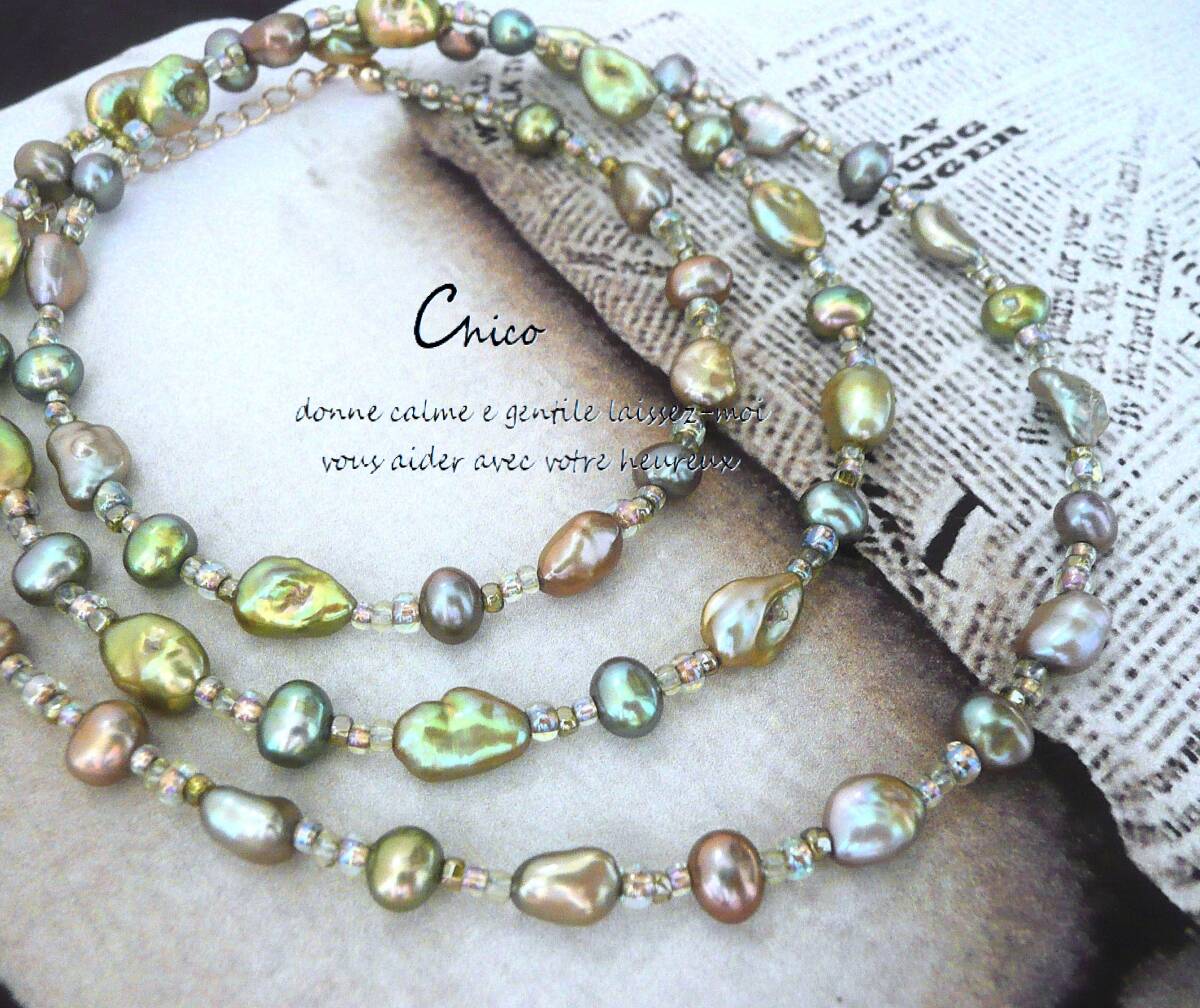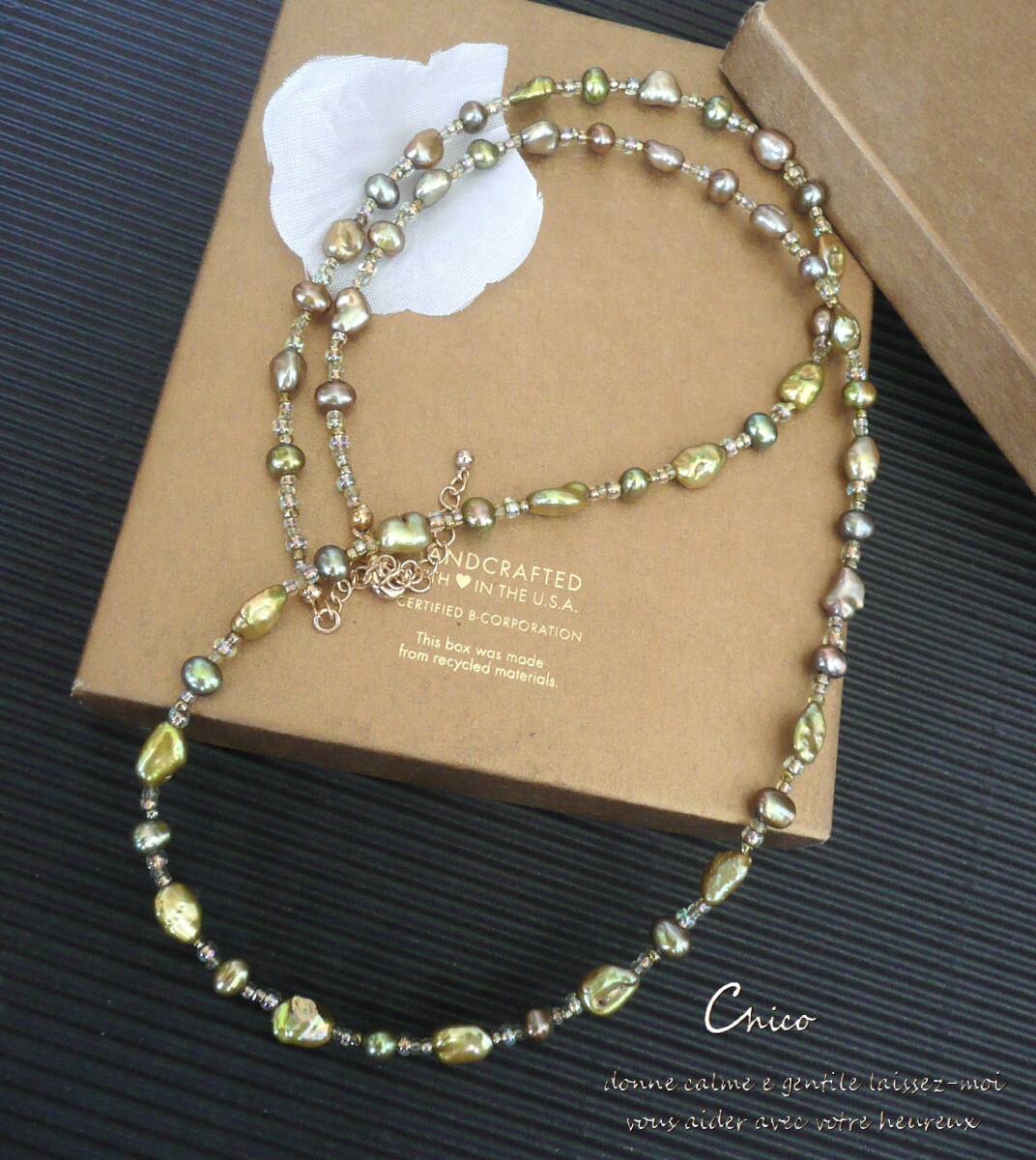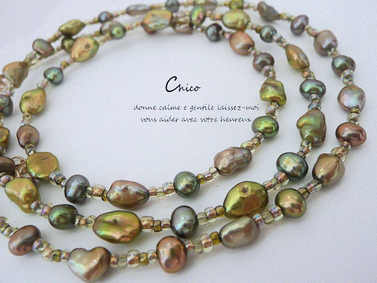 ◆72.5cm◆ライムオリーブゴールド ケシ・オリーブ ケシetc 淡水パール ハンドメイドネックレス ♪ ★2点以上送料無料!★
