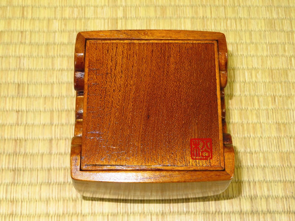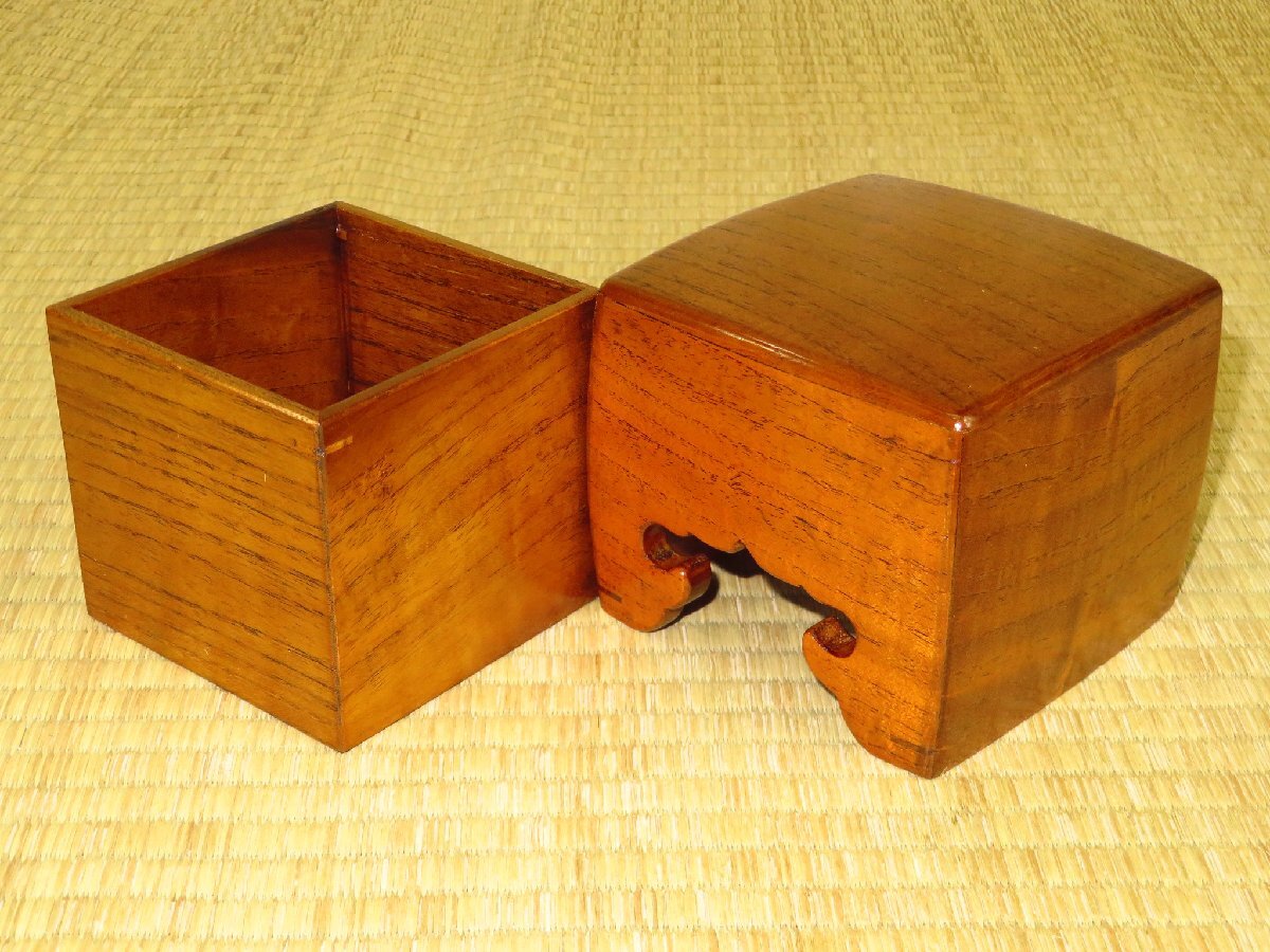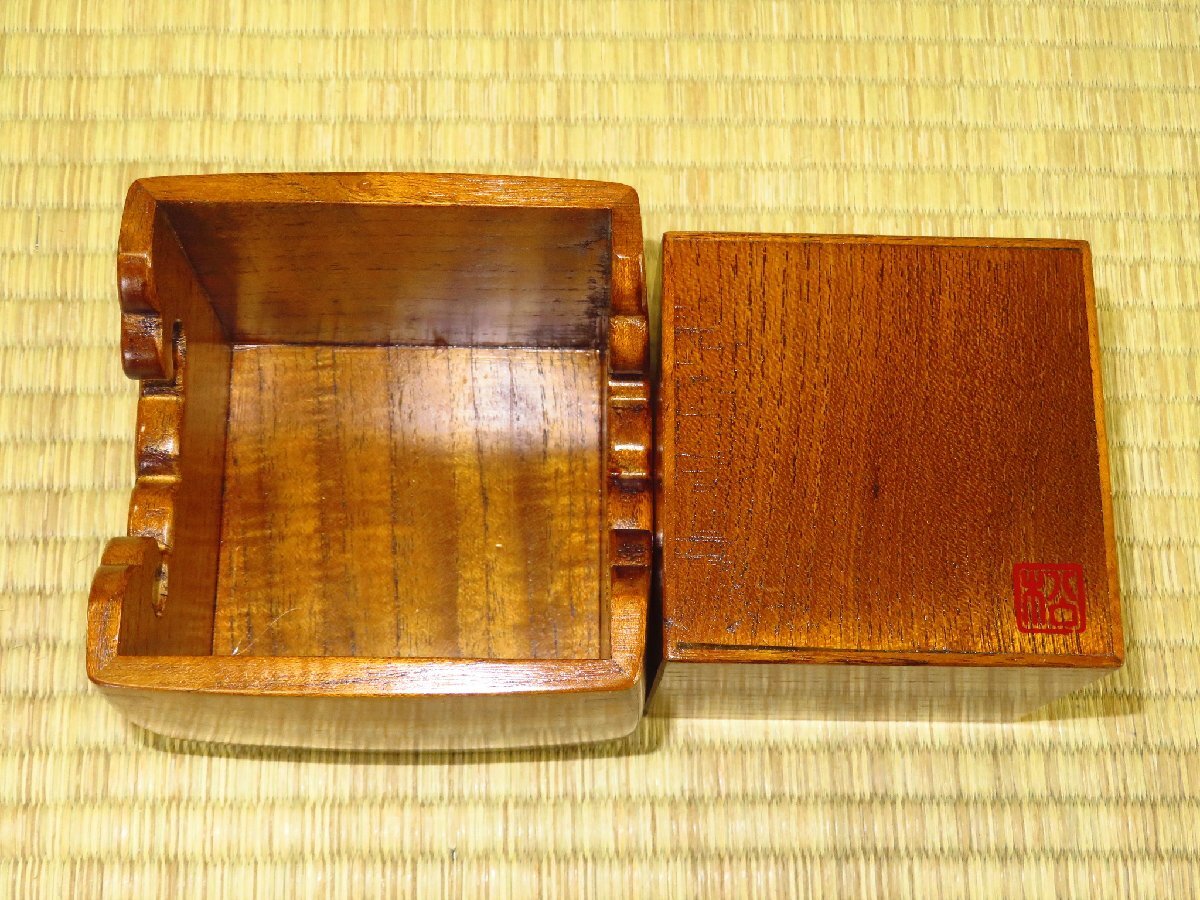 蓋の天板は(単なる接着ではなく)はめ込み式(駒箱によく有り勝ちな蓋の天面と側面の微妙なズレが生じません)、もちろん蓋の下部、内箱の上部にトメ(チギリ)が埋めてあります。