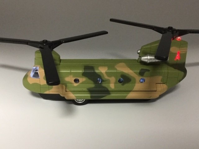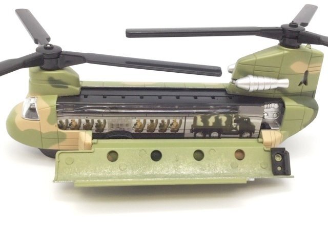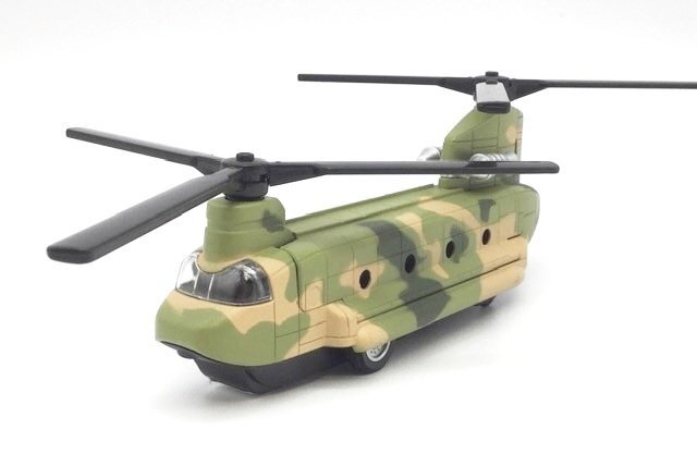 軍用輸送ヘリコプター CH-47 チヌーク グリーンカモ ミニカー トイプレーン ボーイング・バートル アメリカ軍 自衛隊 陸上自衛隊 航空自衛隊 1960年代に登場し、現在もなお現役で活躍している軍用輸送ヘリコプターCH-47。 アメリカ陸軍、日本の自衛隊、その他さまざまな国の軍隊で愛用され続けています。 そんな軍用輸送ヘリコプターCH-47チヌークをイメージしたトイプレーンです。 プルバック機能付きですので、チョロQみたいに走らせることができます。 プルバック走行時、ツインローターが連動して回転します。 CH-47はタンデムローター(前と後ろのローターが違う方向に回転)ですが、 このミニカーも実機同様に前後逆方向にローターが回転します。 内蔵のボタン電池(LR 1130が3個)はプラスドライバー1本で容易に交換可能。 機体後部(後輪)を押すとコックピット、カーゴエリア左側と尾灯のライトが点滅します。 同時にサウンドを楽しむことが出来ます。 「インカミング!(ヘリコプター飛行音)」 機体真ん中部分のカーゴエリアですが、左側が開閉可能なハッチになっていて内部の兵士やトラックを見る事ができます。 左側ハッチを開けるとコックピット、カーゴエリア左側と尾灯のライトが点滅します。 同時にサウンド(セリフとミュージック)が流れます。 管制官:「イーグル2! ユーメイ デパート ナウ」 パイロット:「ラジャー イーグル2」 機体上部は強固な金属製。 機体下部、ツインローター、コックピットはプラ製。 サイズ:長さ約25cm 幅約13.5cm 高さ約7cm こちらの商品は箱入り商品ではございませんのでご注意くださいませ。 ●神経質な方にはお勧めできません● 1台1台検品し丁寧に梱包させて頂きますが 入荷時からのかすかな傷や汚れ等があるかもしれません。 あらかじめ、ご了承下さいませ。 |