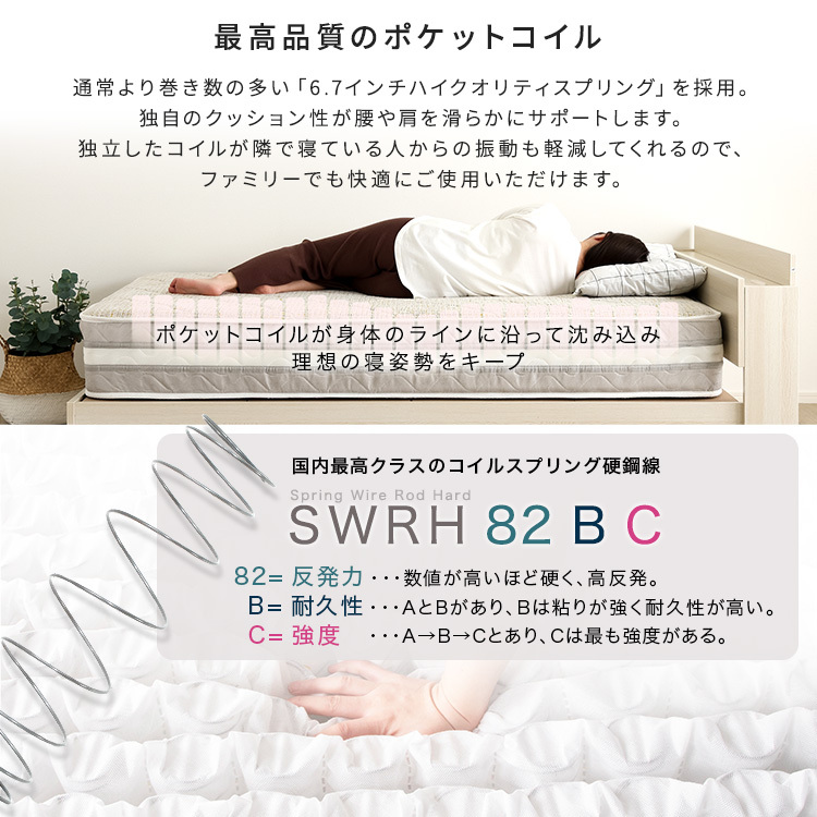マット中材:ポケットコイル、ウレタン、不織布、防ダニ抗菌綿