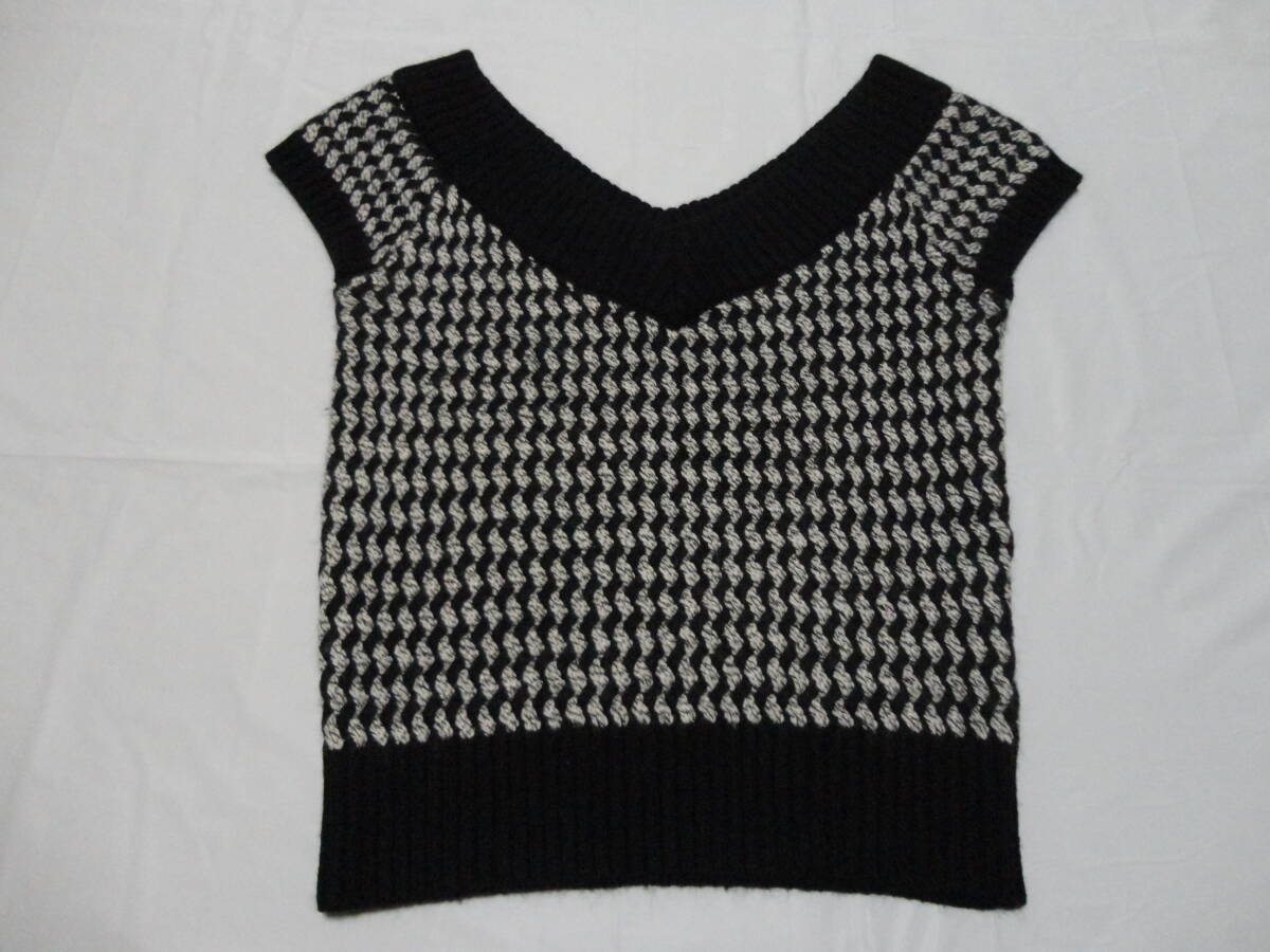 口のブラックラインに、変則チェック柄が、可愛く上品で印象的な、日本製のノースリーブニットセーターです。