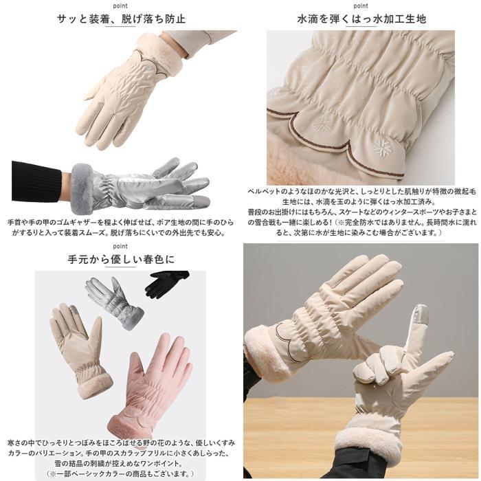 | 商品説明 | ・・木枯らしが吹く日も、もこもこのあったかヴェールで指先ぽかぽか♪コートの手元がパッと華やぐ「レディース ふわふわ防寒手袋」が新登場。 ・【指先まで、まるで春の温もり】 ・生地内部にはたっぷりの中綿を充填。手袋内側は毛足の豊かなもこもこのボアが手のひらを優しく包んで、真冬のお出掛け先でも指先はぬくぬくの暖かさ♪ ・【冷たい風をシャットアウト】 ・手首折り返しの縁取りは、うさぎの背中みたいにふわふわのフェイクファー。手袋の中の暖かな空気を逃がさず、冷たい風や雪の侵入もシャットアウト。 ・【手袋をしたままスマホ操作OK!】 ・右手人差し指の先端部分に特殊な導電素材を使用することで、スマホ操作に対応。凍える寒さの屋外でも、手袋を着けたままタッチ&スワイプが可能に! ・【サッと装着、脱げ落ち防止】 ・手首や手の甲のゴムギャザーを程よく伸ばせば、ボア生地の間に手のひらがするりと入って装着スムーズ。脱げ落ちにくいでの外出先でも安心。 ・【水滴を弾くはっ水加工生地】 ・ベルベットのようなほのかな光沢と、しっとりとした肌触りが特徴の微起毛生地には、水滴を玉のように弾くはっ水加工済み。普段のお出掛けにはもちろん、スケートなどのウィンタースポーツやお子さまとの雪合戦も一緒に楽しめる!(※完全防水ではありません。長時間水に濡れると、次第に水が生地に染みこむ場合がございます。) ・【手元から優しい春色に】 ・寒さの中でひっそりとつぼみをほころばせる野の花のような、優しいくすみカラーのバリエーション。手の甲のスカラップフリルに小さくあしらった、雪の結晶の刺繍が控えめなワンポイント。(※一部ベーシックカラーの商品もございます。) |