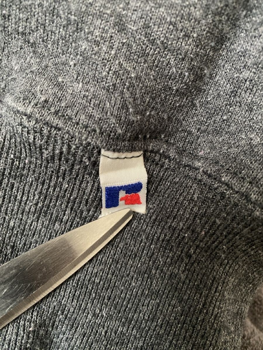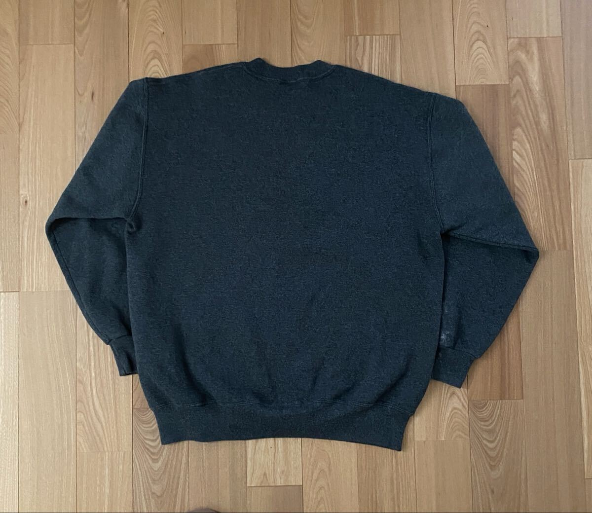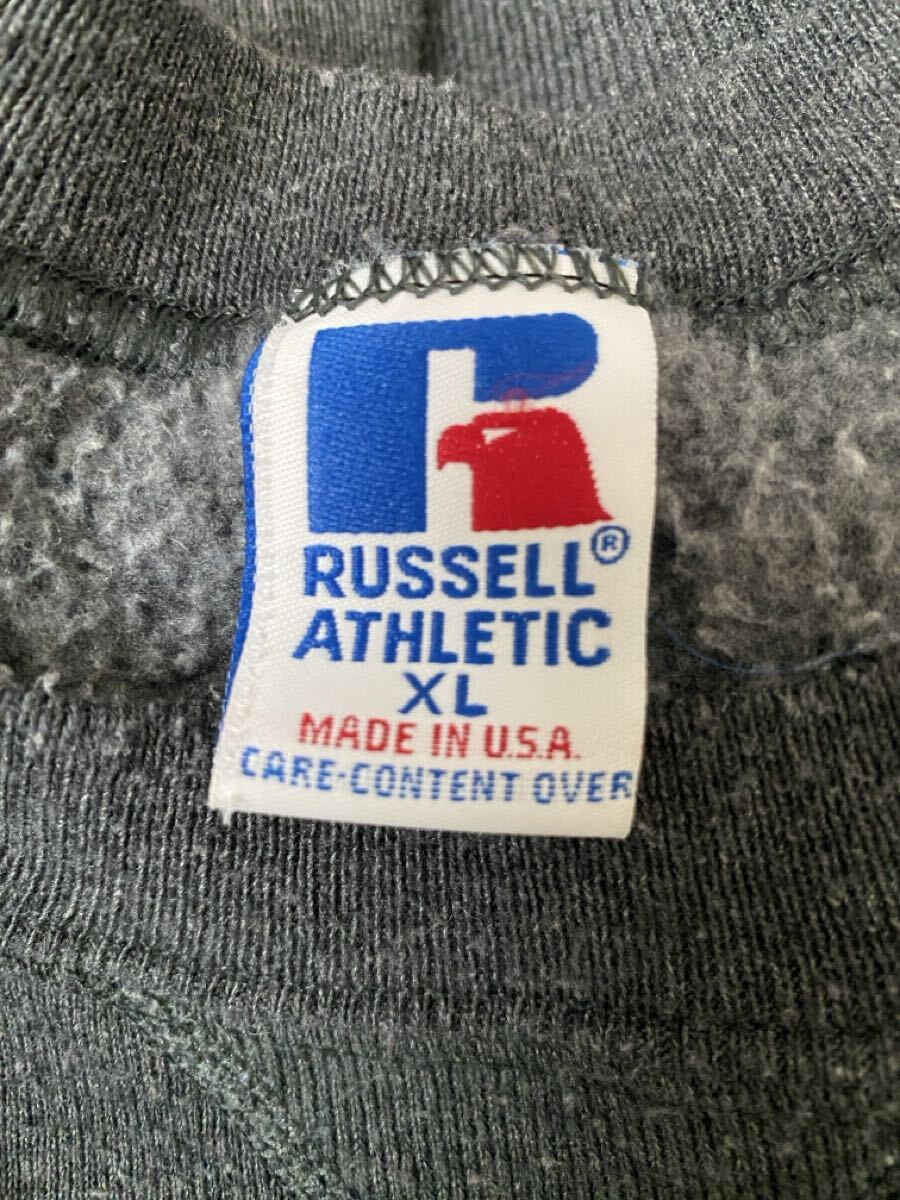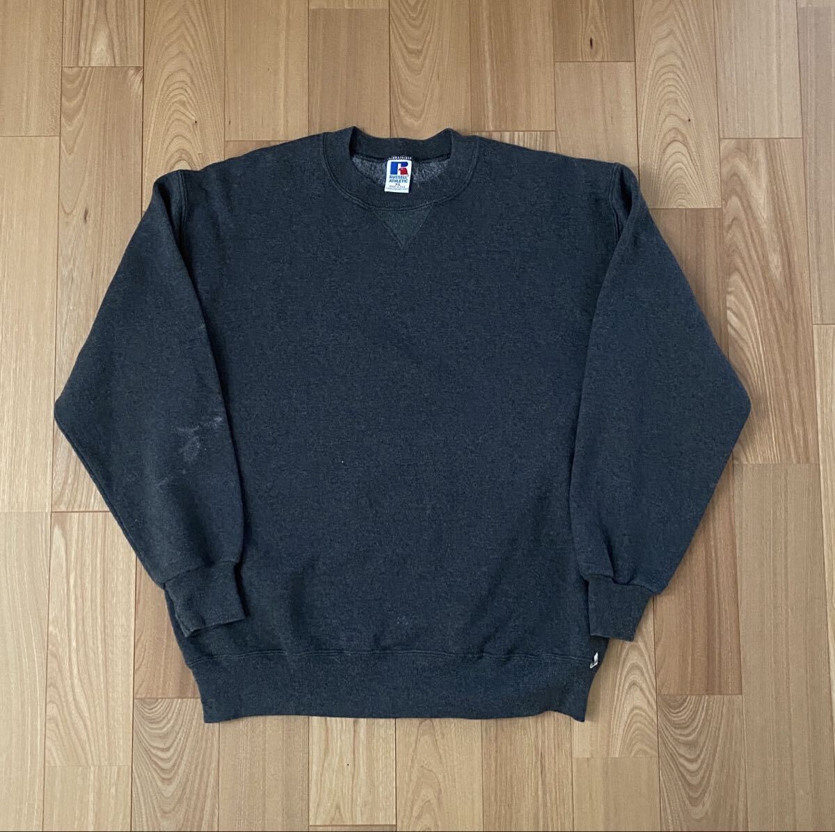 90s RUSSELL ATHLETIC 前Vスウェット。色はダークグレー。素材はコットン50%ポリエステル50%、USA製。ボックスシルエット、裏地起毛。