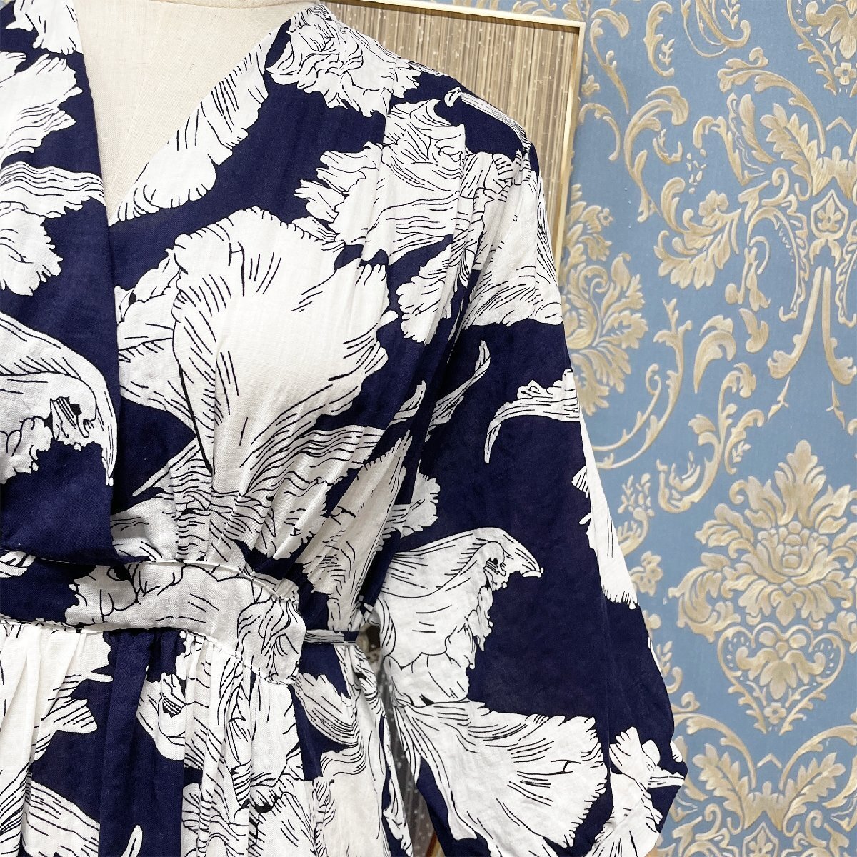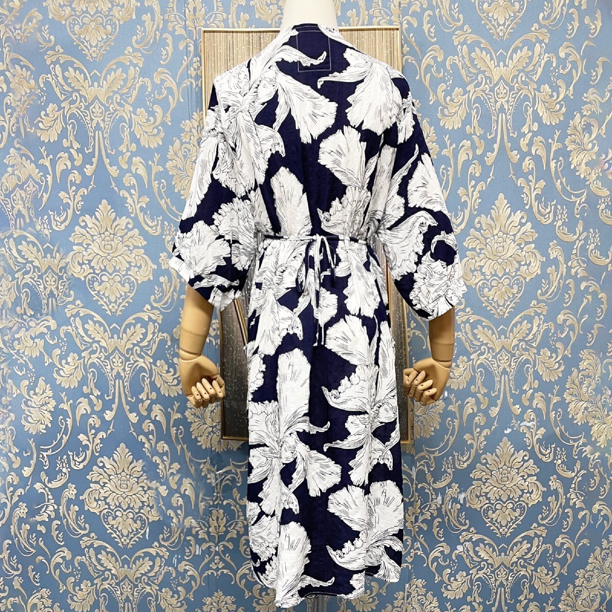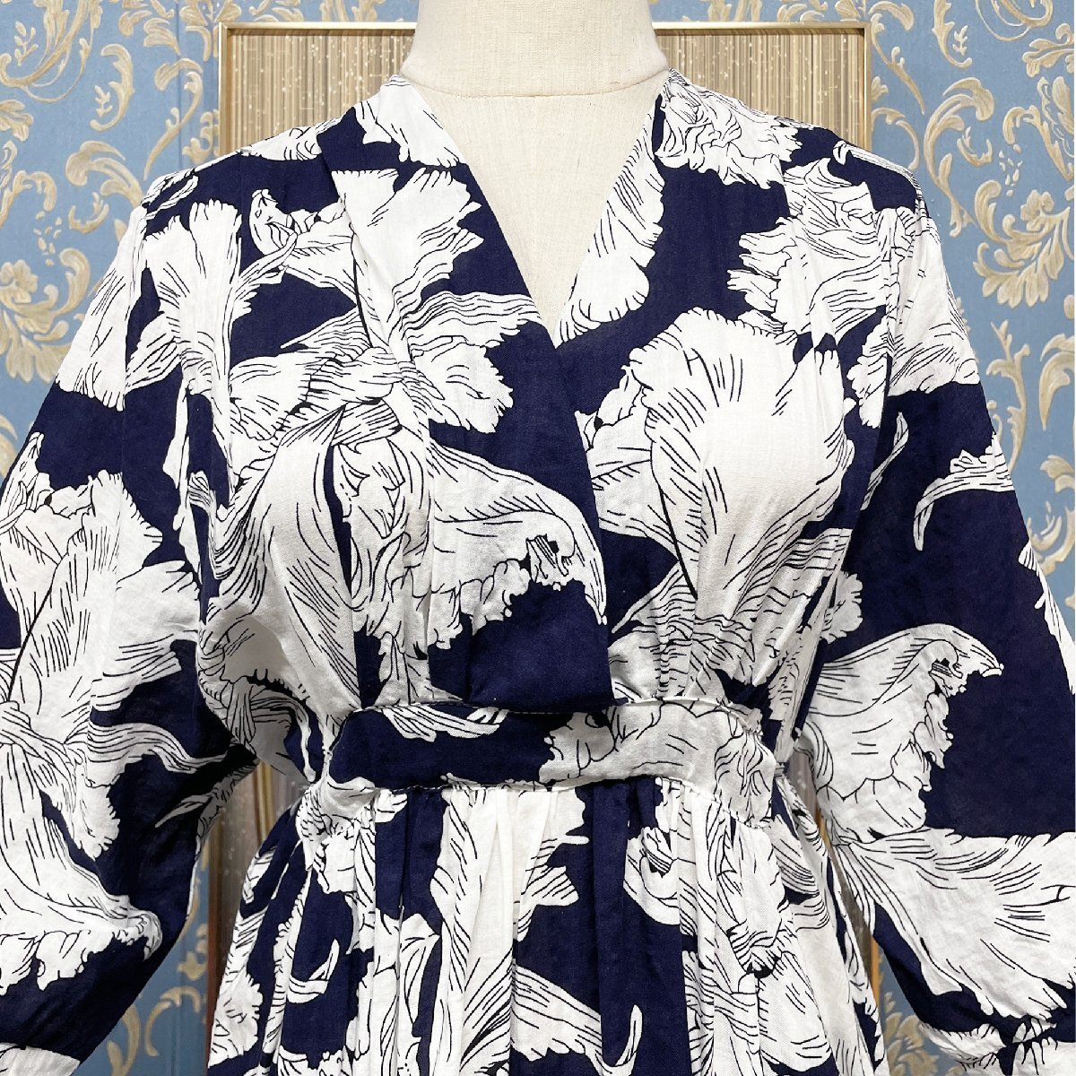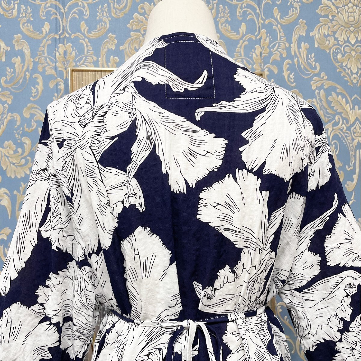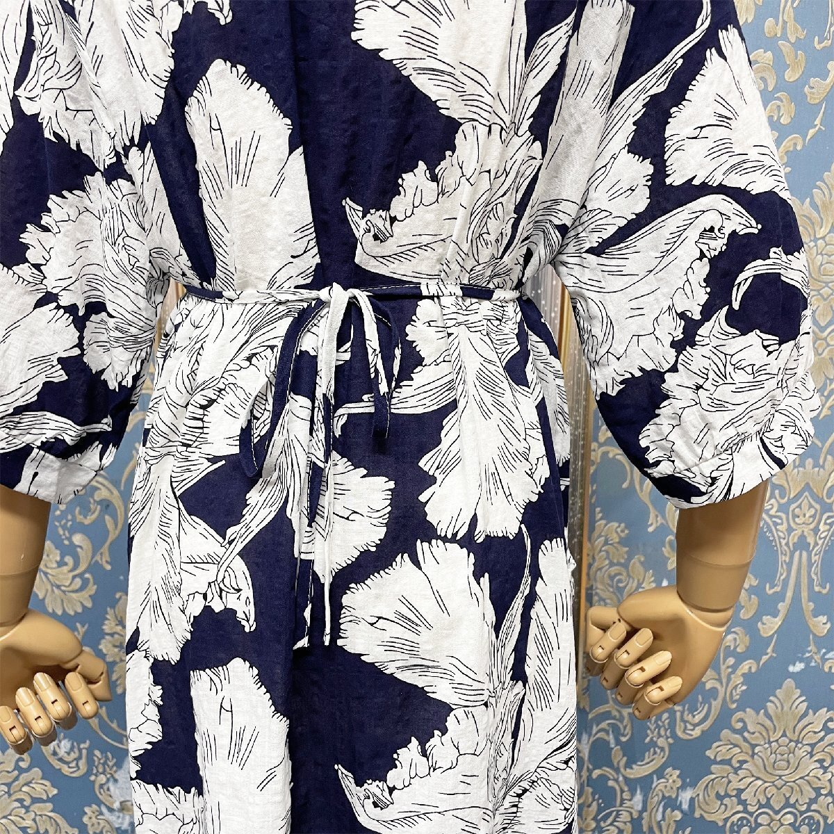 大胆かつ繊細な花々の総柄が上品に際立ち、どんなシチュエーションにも対応できる柔軟性がGood!花の総柄デザインがエレガントでひと際目を引くこと間違いなし!Vネックのデザインで首元を綺麗に見せ、女性らしい余裕のある印象を与えます。ウエスト部分には紐が付いているので、お好みでウエストマークを調整することが可能です。