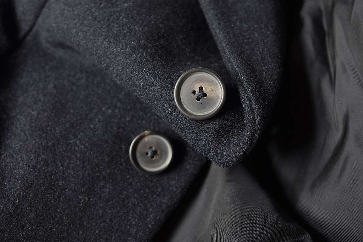 ややワイドなピークドラペルから繋がる比翼仕立てのバランスが現代的で均衡のとれたプロポーションが際立ちます。