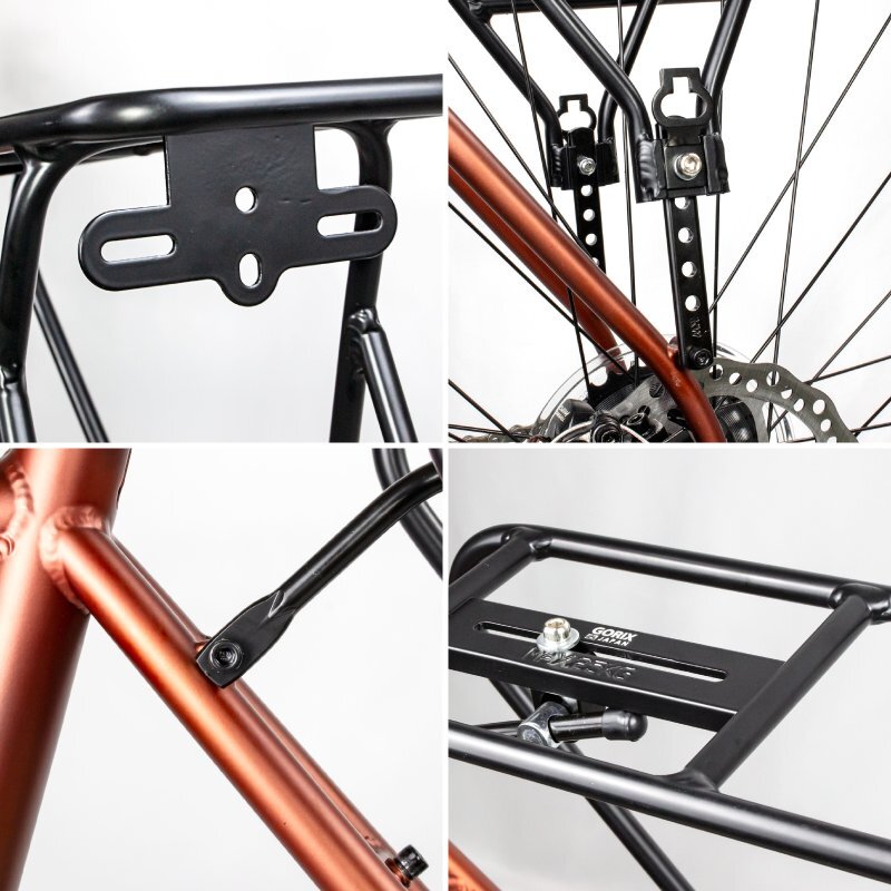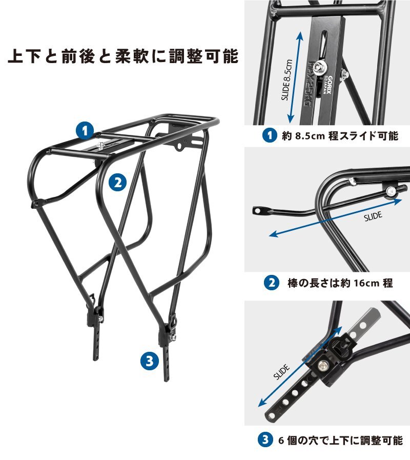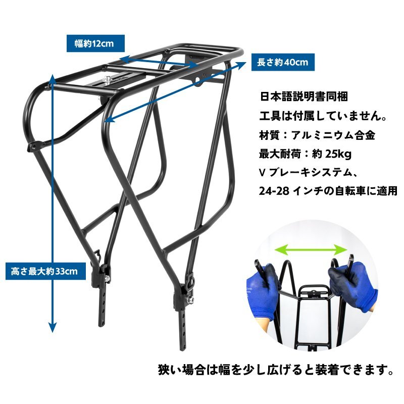 自転車荷台、自転車用リアキャリアを装着して荷物を沢山自転車に積載できる! 自転車通勤・通学やツーリング、旅行、お買物に最適なリアキャリアです。 キャリアを付ける事で背中に汗を掻いて不快な思いをしたり、長時間背負い体に負担を掛ける事も無くなります。 上下と前後に調整可能なので取付角度を柔軟に調整可能。 [アルミ素材] このリアキャリアは品質が良く軽量で耐食性に優れるアノダイズド アルミニウムを採用。 耐食性にも優れて錆びにくい。さらにキャリア表面をアノダイズド(アルマイト)塗装を採用しさらにサビに強く耐久性が向上。 滑らかな表面に仕上がっています。雨の日でも安心です。 [スマートなデザイン] シートステーに装着は1本ですっきりとしています。 全体的にすっきりとして細身な印象を与えてスマートに。 [超耐荷重] 最大耐荷重約25kg!重い荷物を積むことが可能。自転車通勤や自転車通学に最適です。 ツーリングで荷物が増えても安心。 [24-28インチに対応] 24-28インチ、クロスバイク、マウンテンバイク、折り畳み自転車等ほとんどの自転車タイプに適用します。 上下前後の調整が可能で柔軟に自転車にあったサイズで装着可能。 シートステーのダボ穴1点とリアエンドのダボ穴2点で固定します。 [簡単装着] 日本語説明書入りで装着は簡単に行えます。 装着に必要なダボ穴等をご購入前にご確認お願いします。 工具は付属していませんのでご用意下さい。 商品内容リアキャリア 荷台サイズ長さ40×幅12cm、高さ最大33cm 材質アルミニウム合金 最大耐荷約25kg 対応Vブレーキシステム、24-28インチの自転車に適用 《ご注意》 ・商品は入荷によりキズがある場合があります。 ・傷や細かい汚れが気になる方や神経質な方はご購入をご遠慮ください。 ・ディスプレイ環境により実物と色が異なる場合や、入荷時期により予告無く一部仕様変更する場合がございます。 |