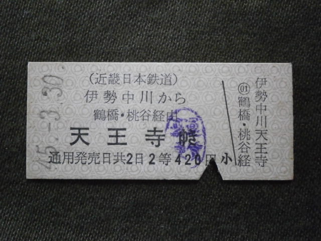 近畿日本鉄道 2等 伊勢中川から鶴橋・桃谷経由 天王寺ゆき乗車券