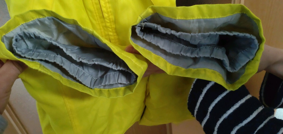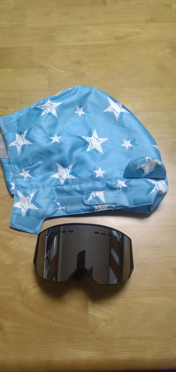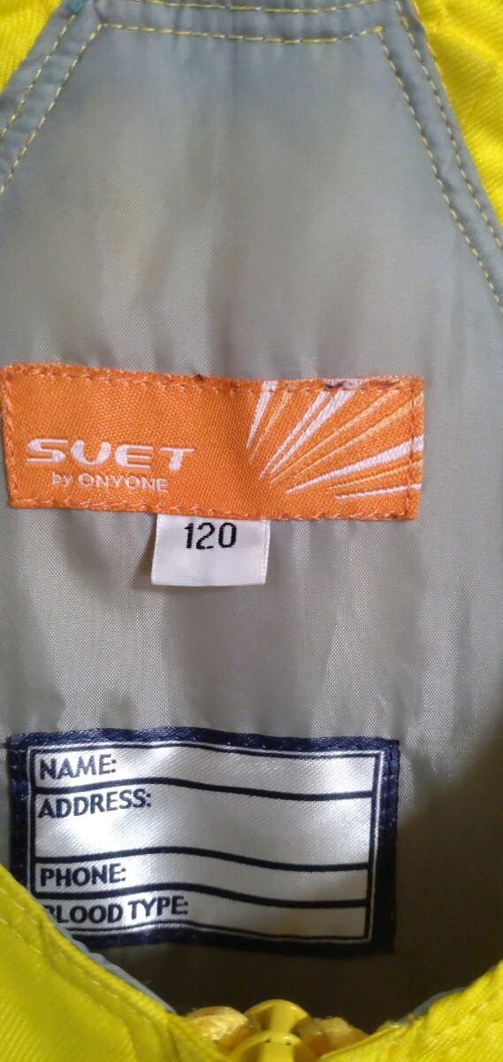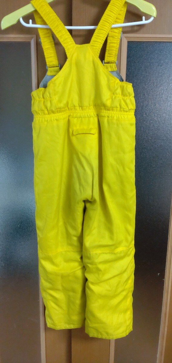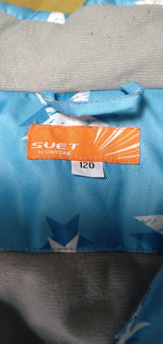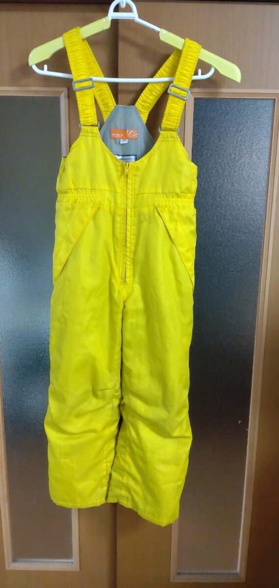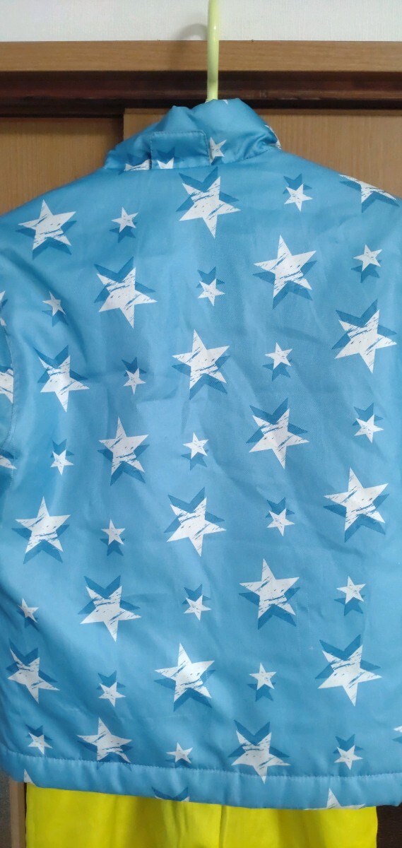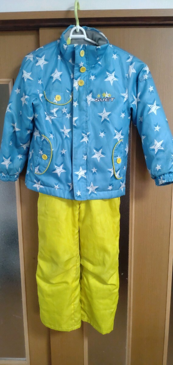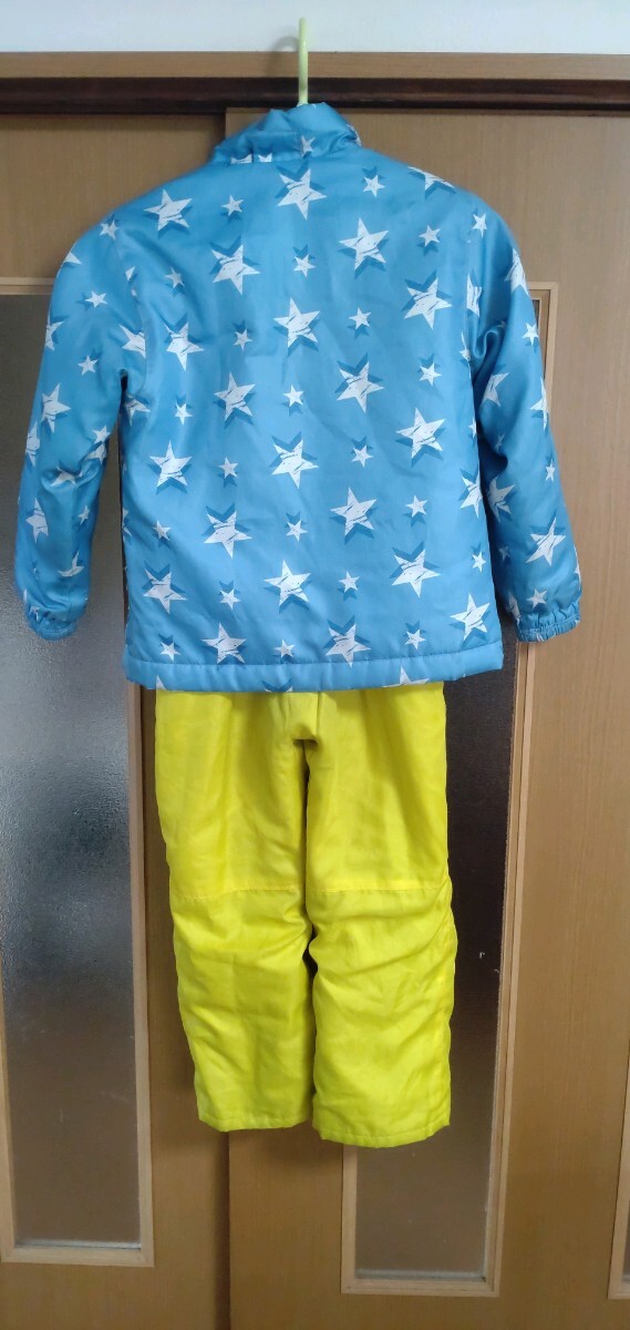 星柄の青いジャケットと黄色のパンツのスキーウェアセット。