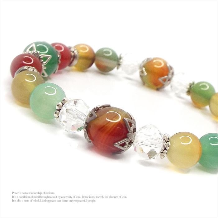 | 【STONE KITCHEN 天然石 パワーストーン】 孔雀瑪瑙は見る人を魅了するほど個性的で 不思議な色のグラデーションはつい見とれてしまいます! 七宝の一つでもあり幸せの象徴で 縁起が良く長寿や健康をもたらすと言われ 勇気や自信や心の安定へ導くとも言われております。 あなたの心を安定させ幸せな生活をもたらしてくれる 組み合わせでデザインした素敵なブレスレットです。 内周:約16cm サイズ:孔雀瑪瑙 約10mm・約8mm カーネリアン 約8mm 1点 注意事項 ※金属部分は汗や汚れ等で変色する場合がございます。気になる場合は 金属磨きや布等で軽くふき取る事をおすすめします。 ※石の種類によっては、艶を引き出すことを目的として、ワックスや着色加工がされているものもあります。 ※表示のサイズは必ずしも最大値・最小値のサイズのものが入っているわけではございません。 ※天然石のため同じものでも色味・模様などが異なります。 ※照明の具合で実際とは色合いが異なる場合がございます。 また、天然素材特有のクラック・内包物を有する場合がございます。予めご了承下さい。 | |