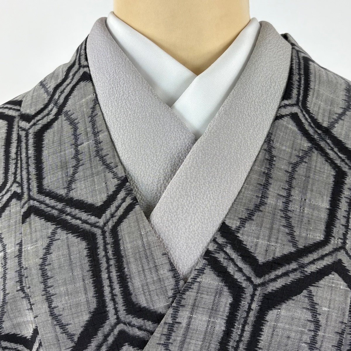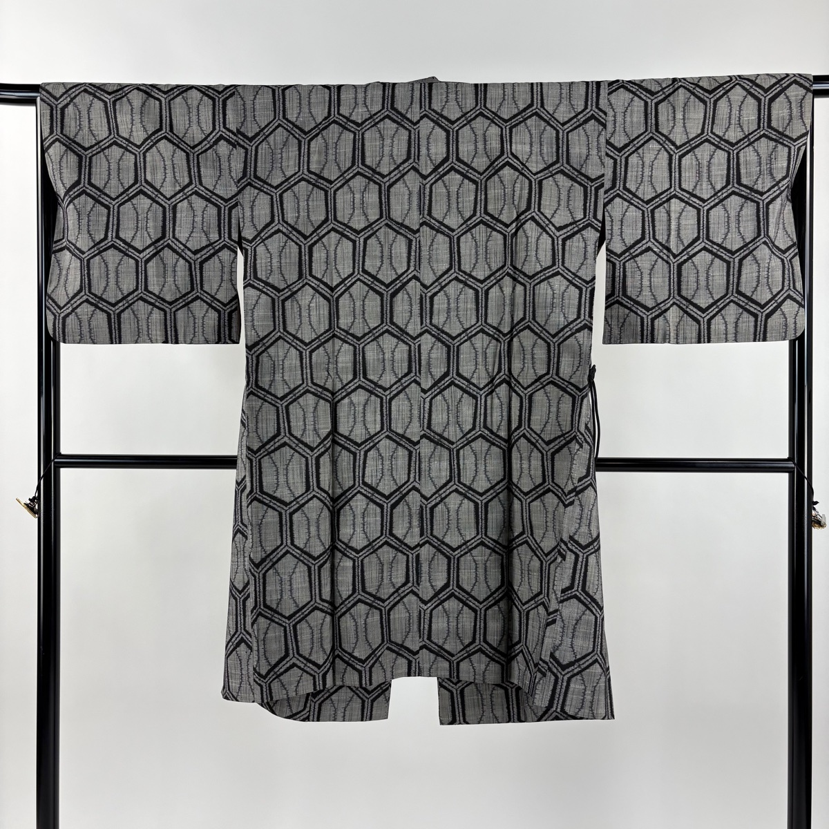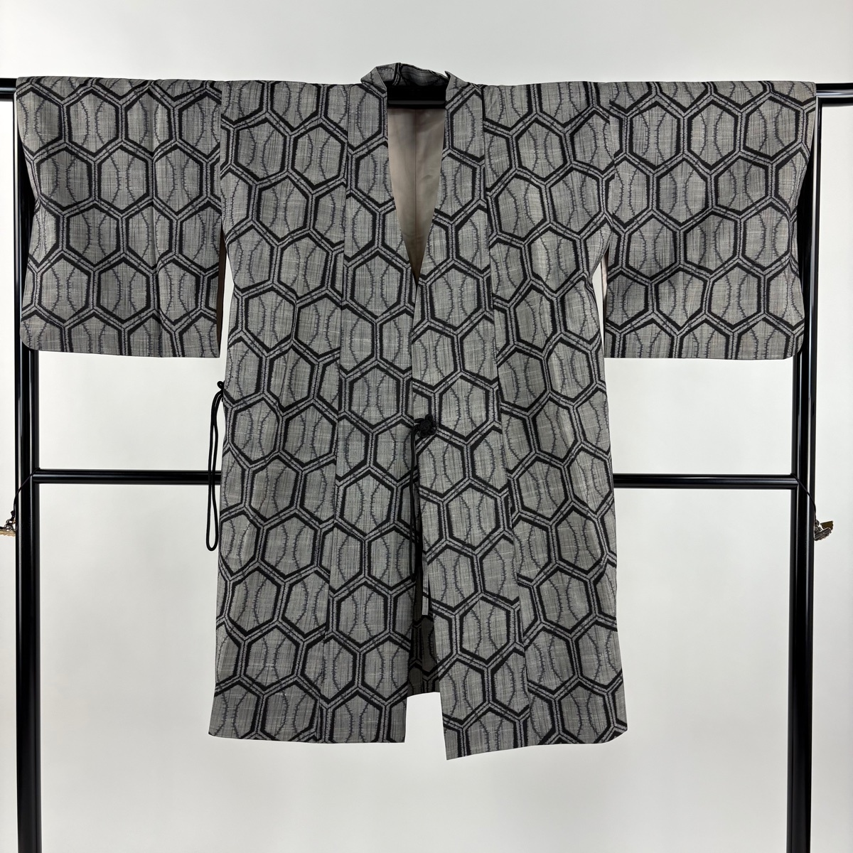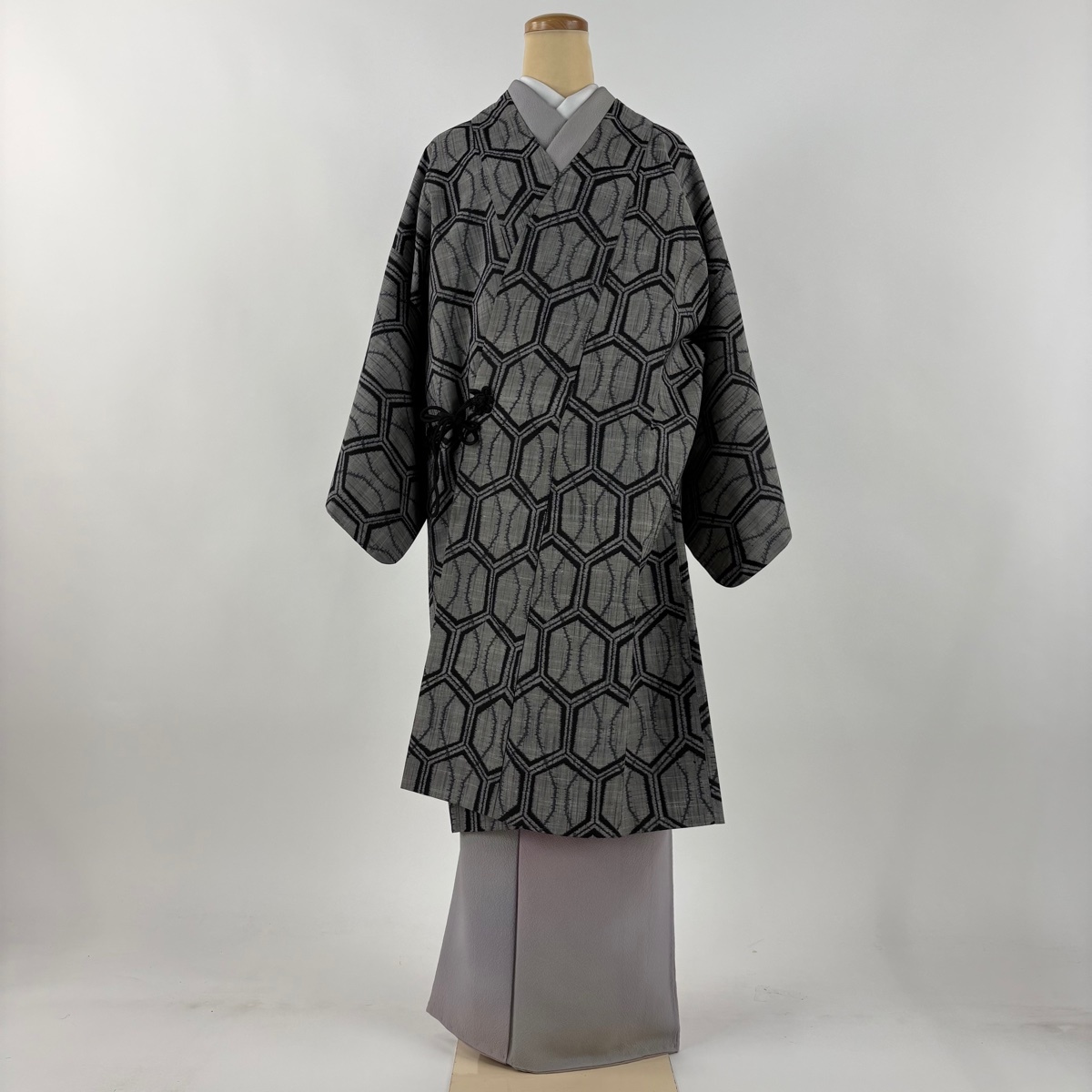 | 道中着 美品 秀品 和装コート 紬地 亀甲 立涌 灰色 身丈108 裄丈67 M 正絹 【中古】 |