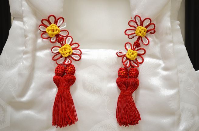 白地の高級感のあるかわいい被布です。花柄の飾り紐が上品です。