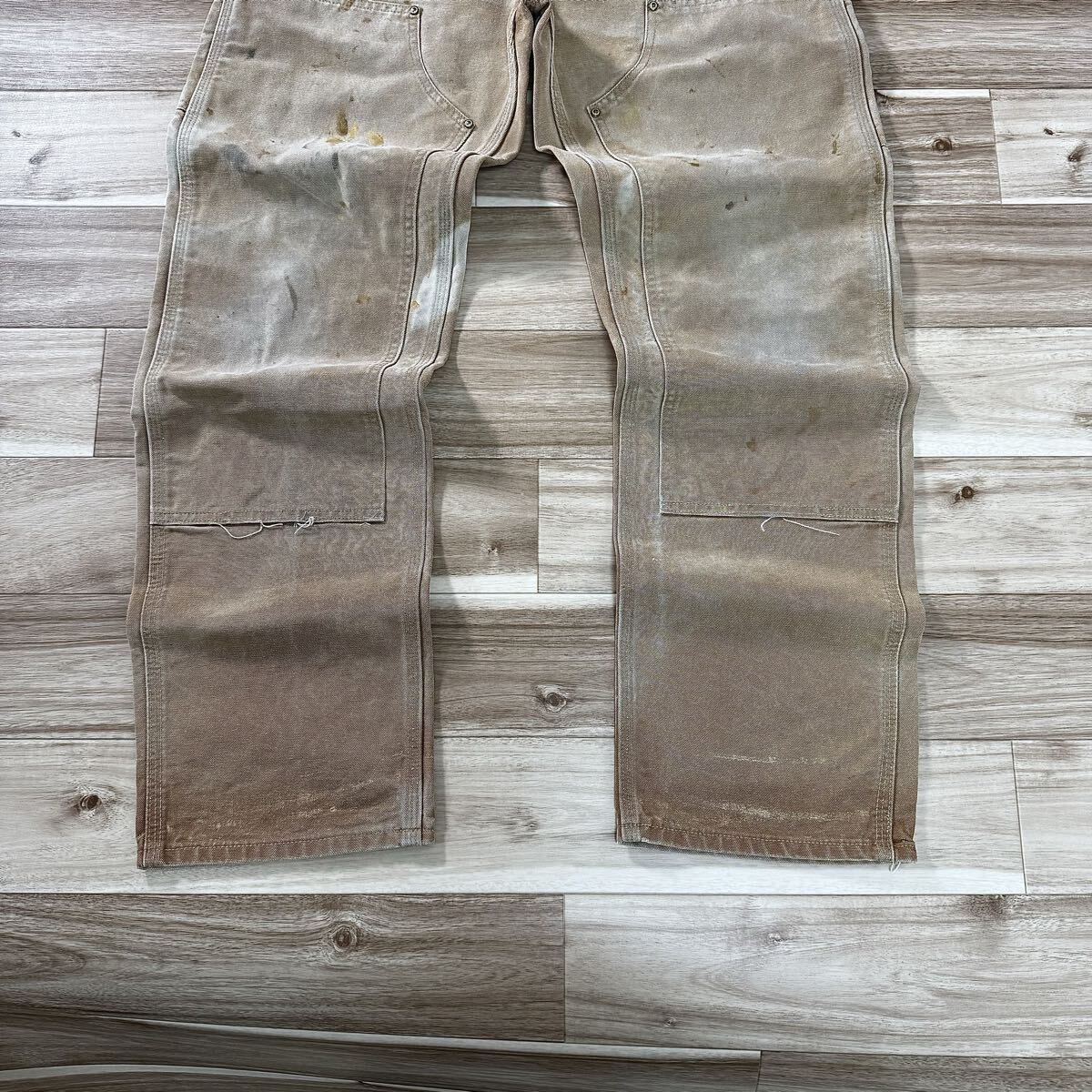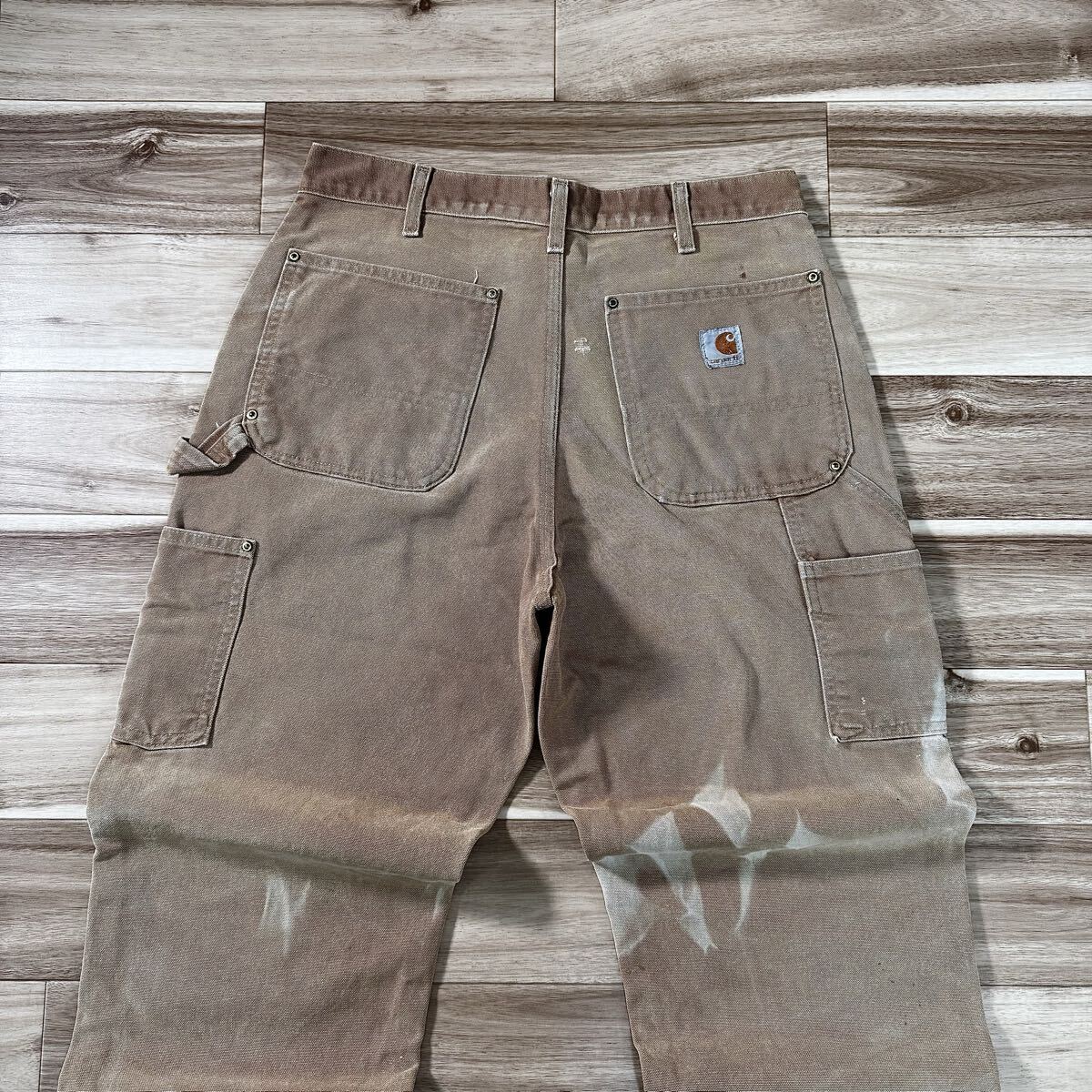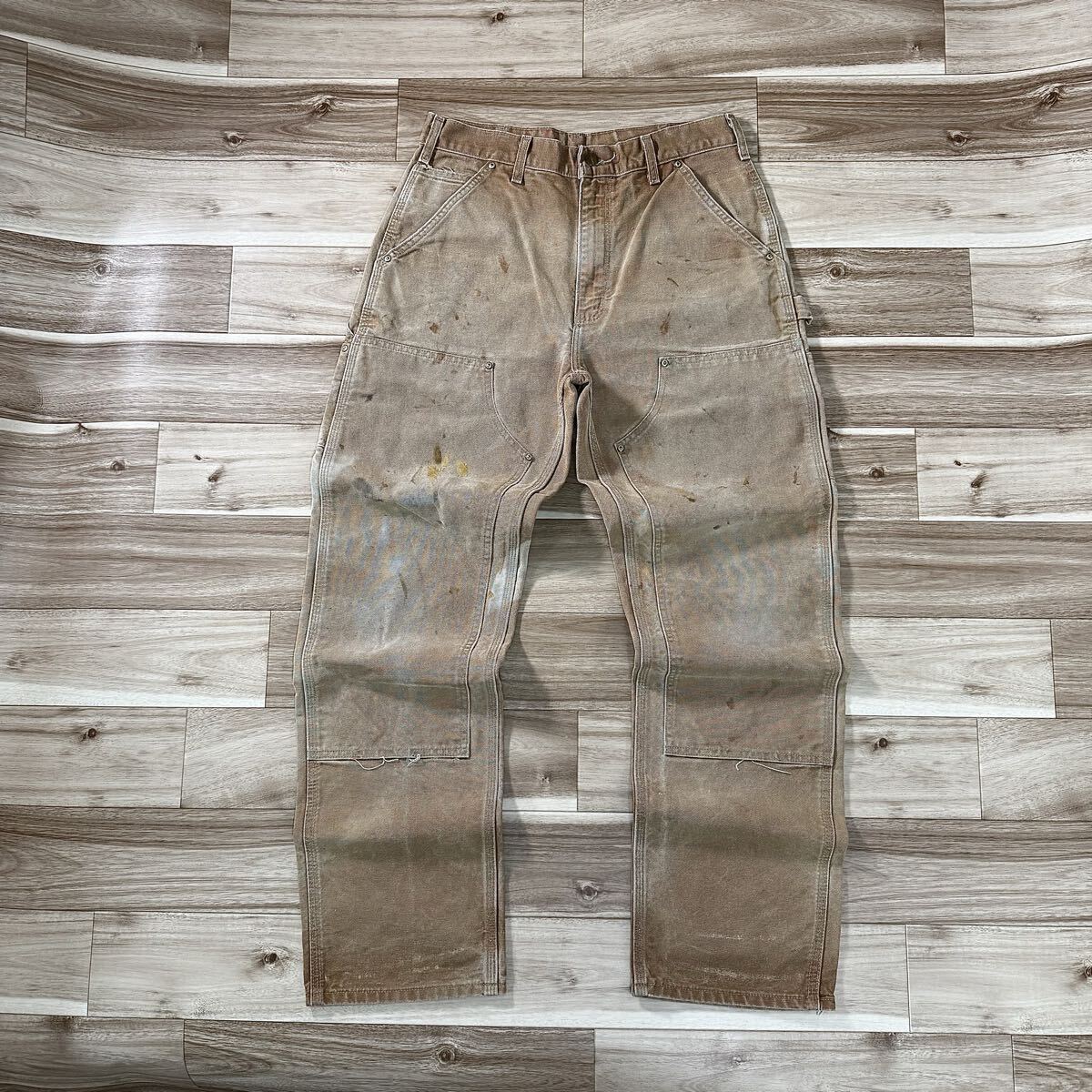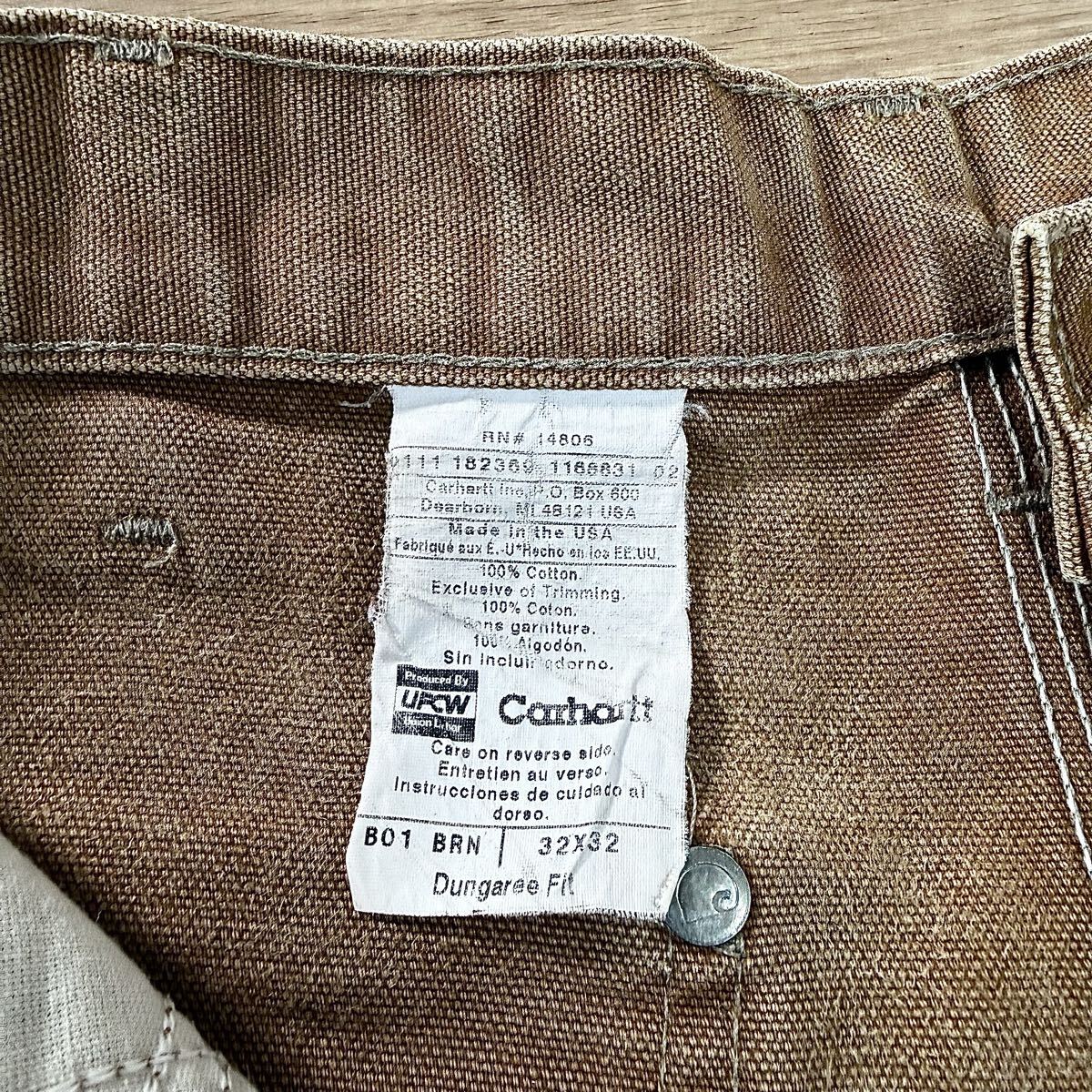 USA製のCarhartt B01 ダブルニー。リアルワークで使い込まれたブラウンダックが、唯一無二の極上フェードへと進化した一本です。ブリーチ跡や汚れも雰囲気抜群で、加工では表現できないヴィンテージ感が魅力。YKKチャック、金ボタンなど細部までオールドらしさを感じられるスペシャルな仕上がり。古着・アメカジ好きに刺さる“一点物”です。