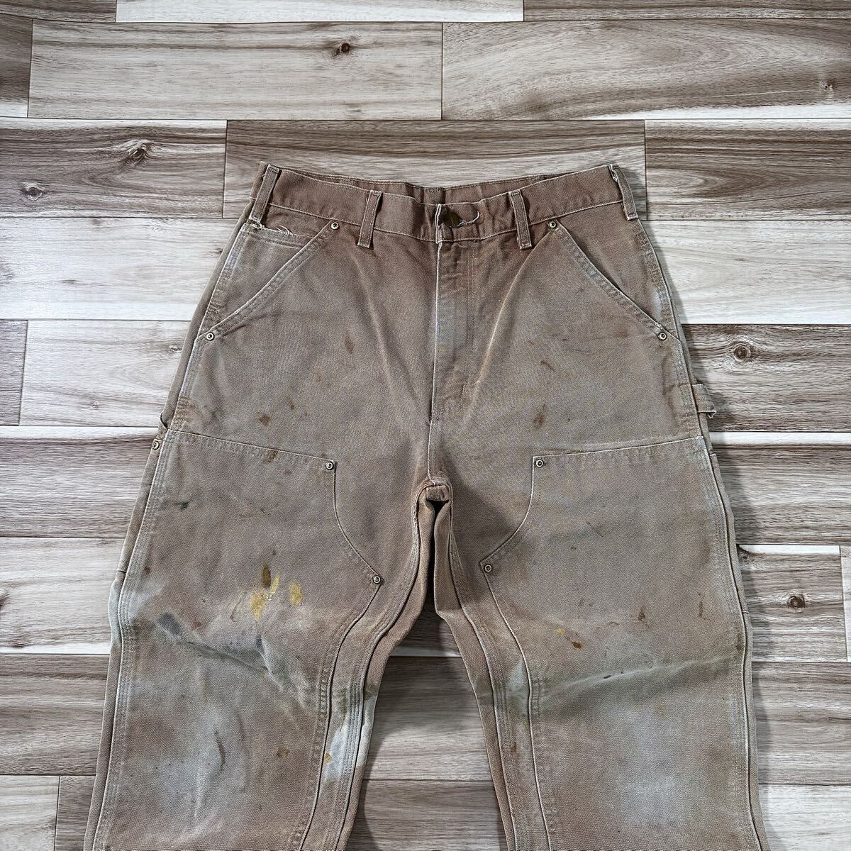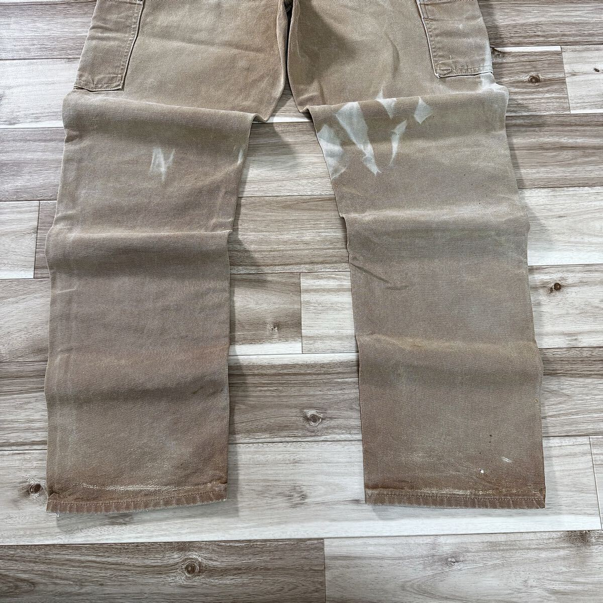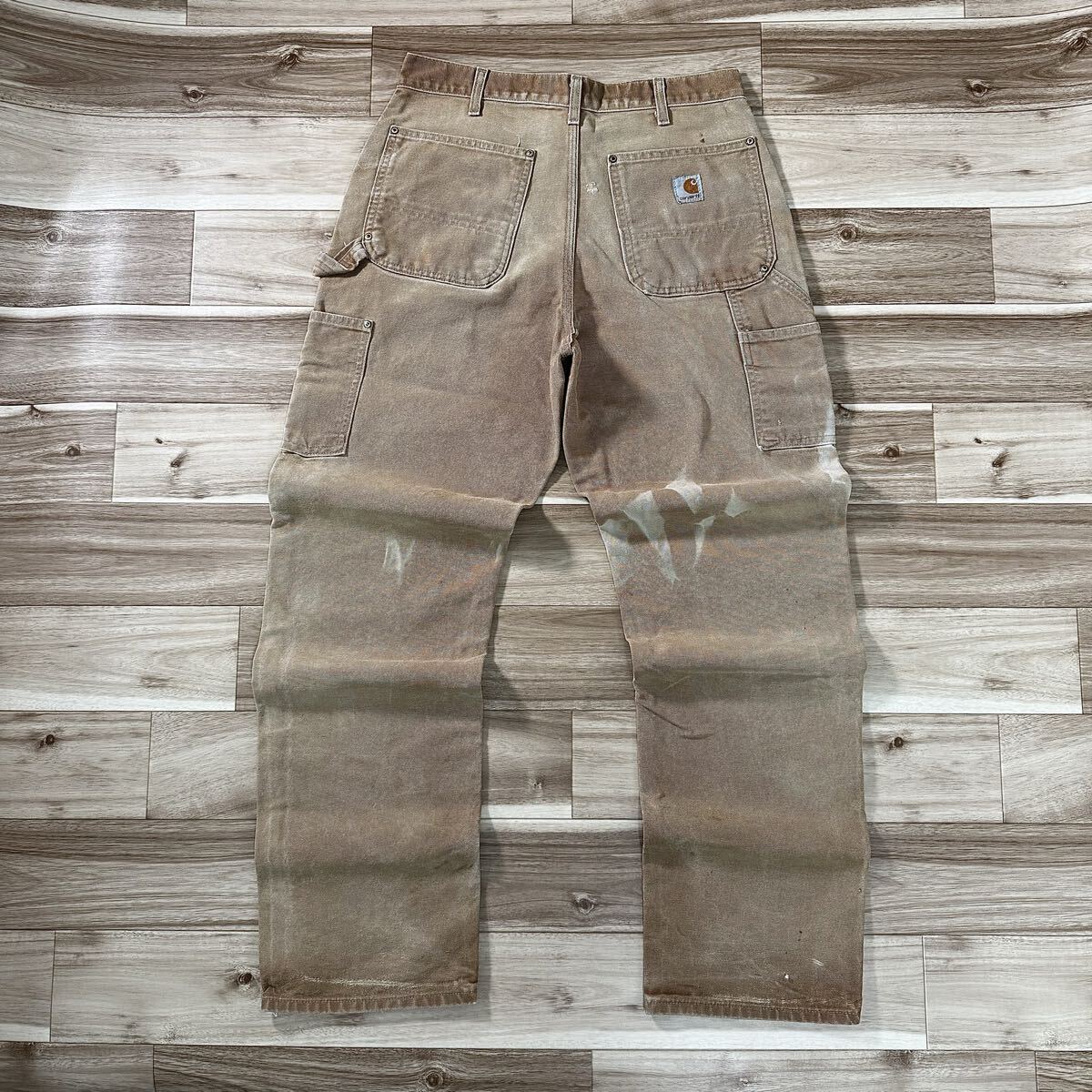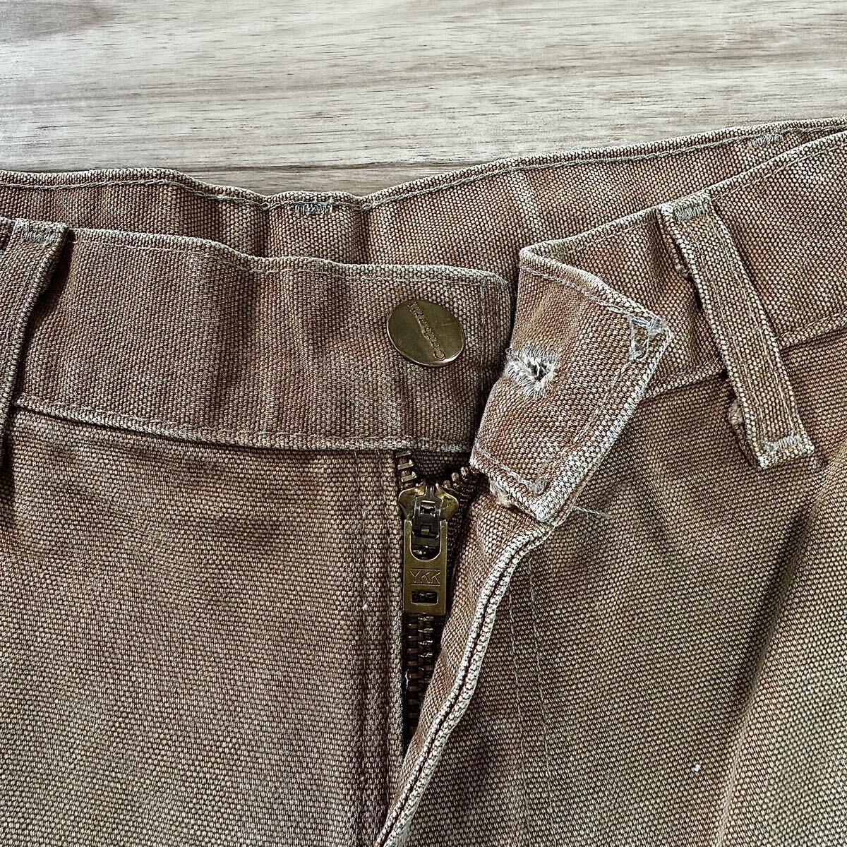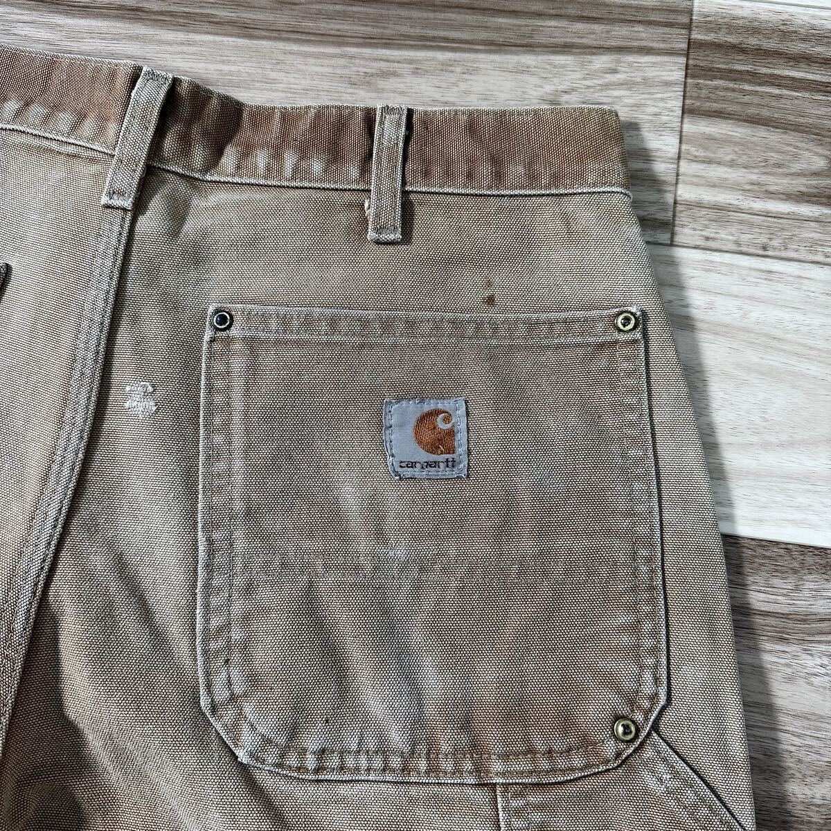 USA製のCarhartt B01 ダブルニー。リアルワークで使い込まれたブラウンダックが、唯一無二の極上フェードへと進化した一本です。ブリーチ跡や汚れも雰囲気抜群で、加工では表現できないヴィンテージ感が魅力。YKKチャック、金ボタンなど細部までオールドらしさを感じられるスペシャルな仕上がり。古着・アメカジ好きに刺さる“一点物”です。