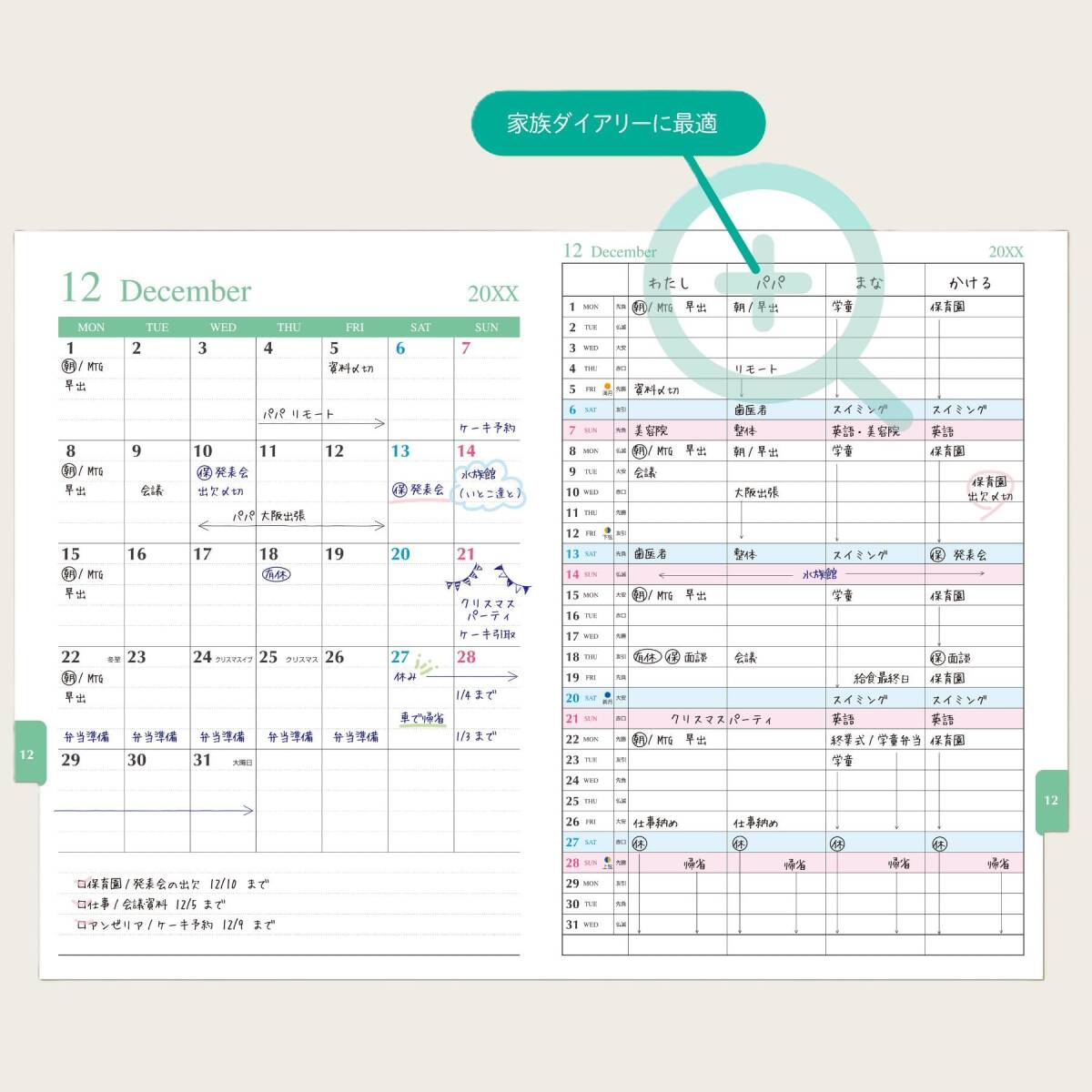 左ページは予定を把握しやすい月間ブロック、右ページは家族の予定、プロジェクト管理、家計簿などに最適な4項目のリスト。