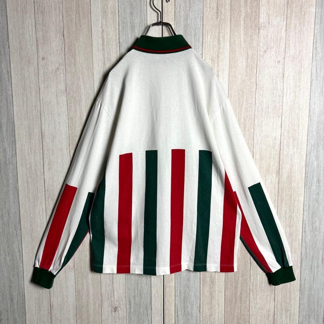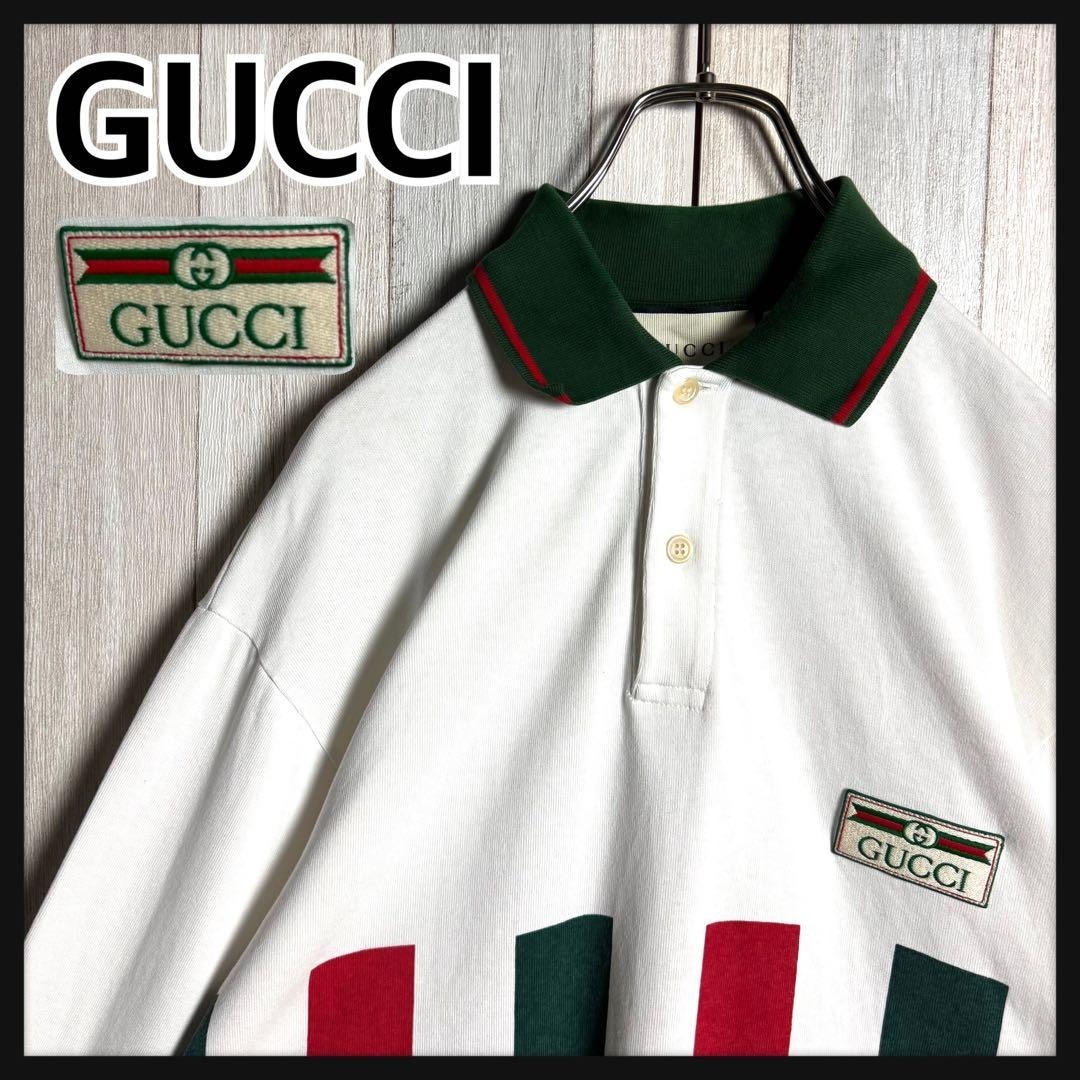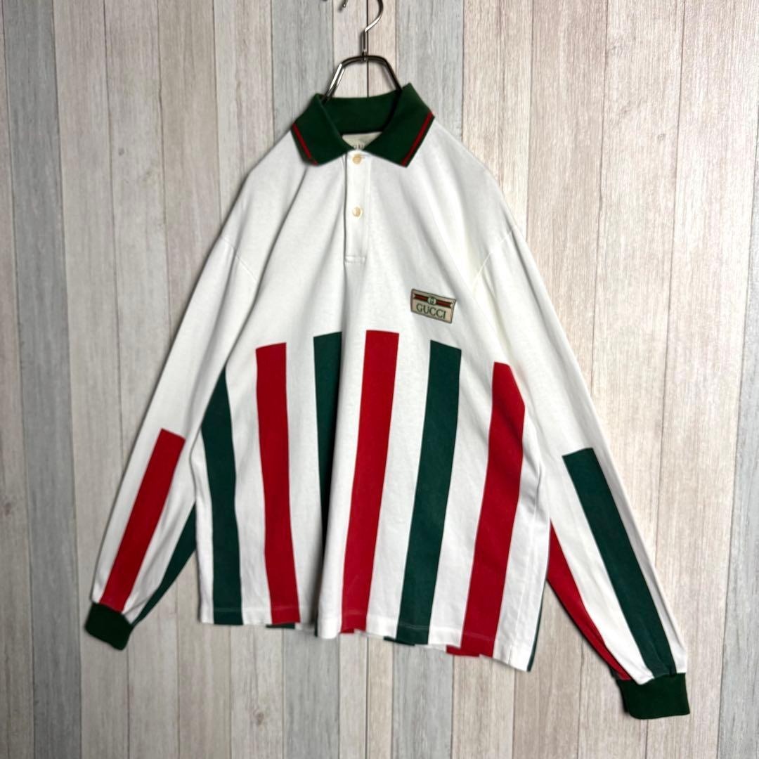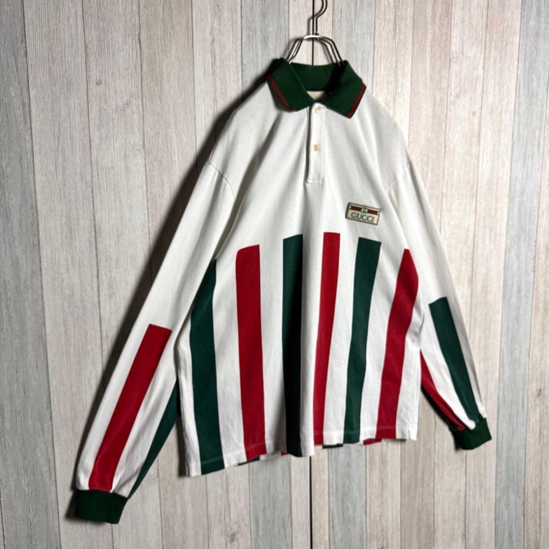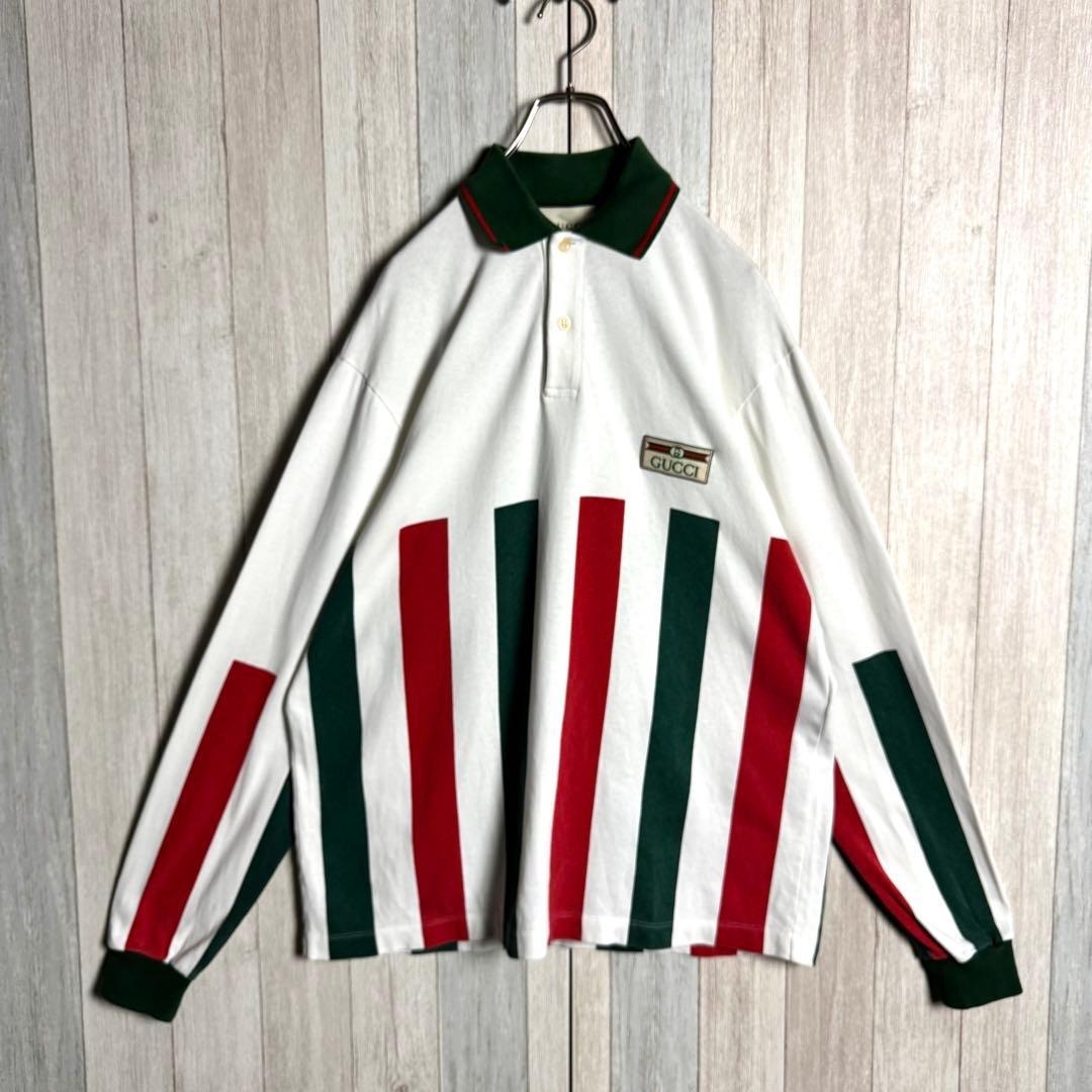【希少デザイン・美品】イタリア製 GUCCI グッチ シェリーライン&刺繍ワッペンロゴ 長袖 ポロシャツ ホワイト 白 実寸XL相当