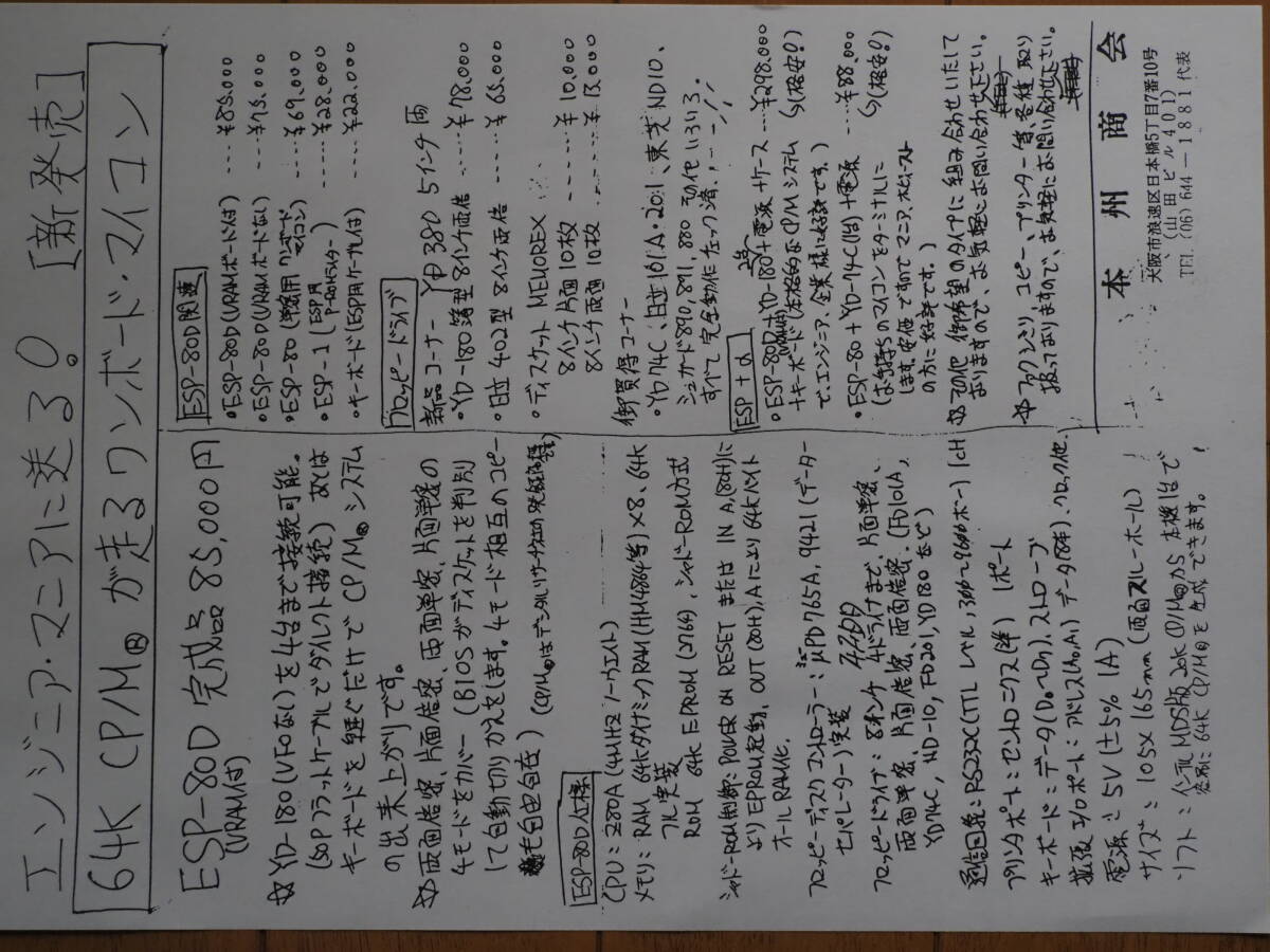 うろうろ探索していて裏通りの一件の店に 「64K CP/M が走るワンボードマイコン」の張り紙を見つけ数か月悩んだ末に購入に至りました。