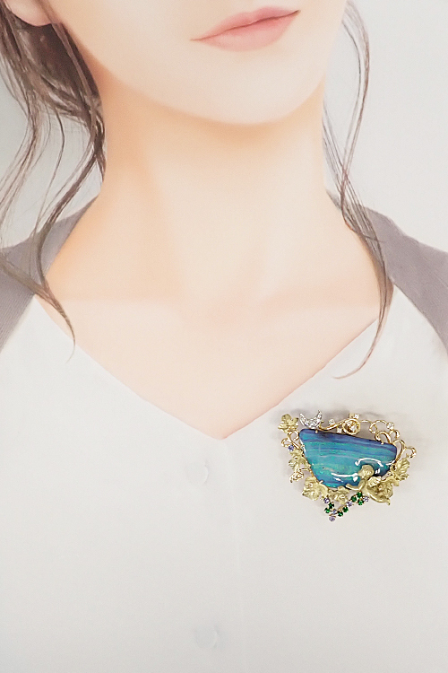 コメント若林佐代子の、天使が夜空を見上げて思いをはせているようなシーンをボルダーオパールの自然の色合いを用いて見事に表現した、メルヘンな雰囲気のペンダントブローチです。生き生きとした線を描くツルや葉、天使の細やかな彫刻など、細部にまでこだわりを感じるお品です。