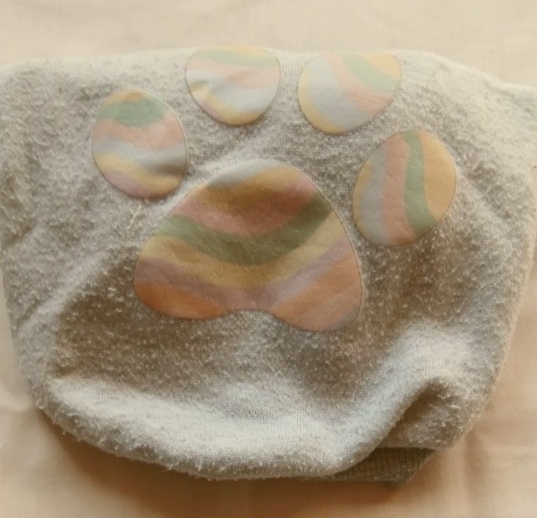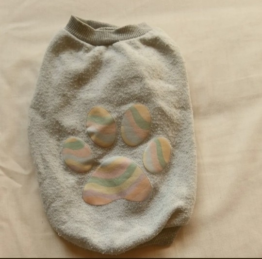 犬用のペットウェアです。生地にカラフルな肉球柄が特徴です。全体的に毛玉や使用感が見られます。