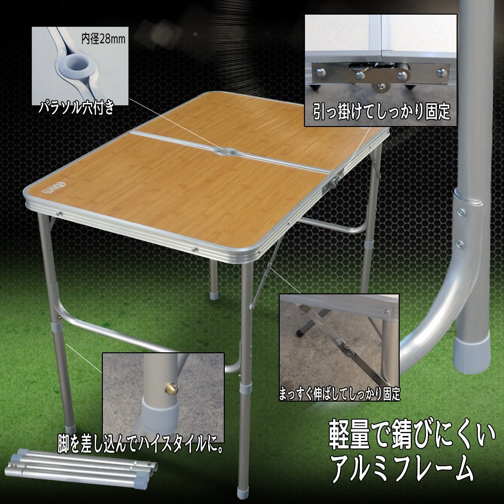 BBQやアウトドアに最適なコンパクトに折りたためるおしゃれなピクニックテーブル!! 車のトランクに入れる時や持ち運びの際にもとても便利な取っ手付きで持ち運びもラクラク!! サビに強いアルミを使用。 テーブルは2段階の高さ調節ができ、お好みのスタイルに合わせて 天板中心部にはパラソル用ホールがあるので、ベランダやテラスでの使用にもおススメです。 キャンプ、バーベキュー、お花見などにとても便利。 ■商品仕様■ |