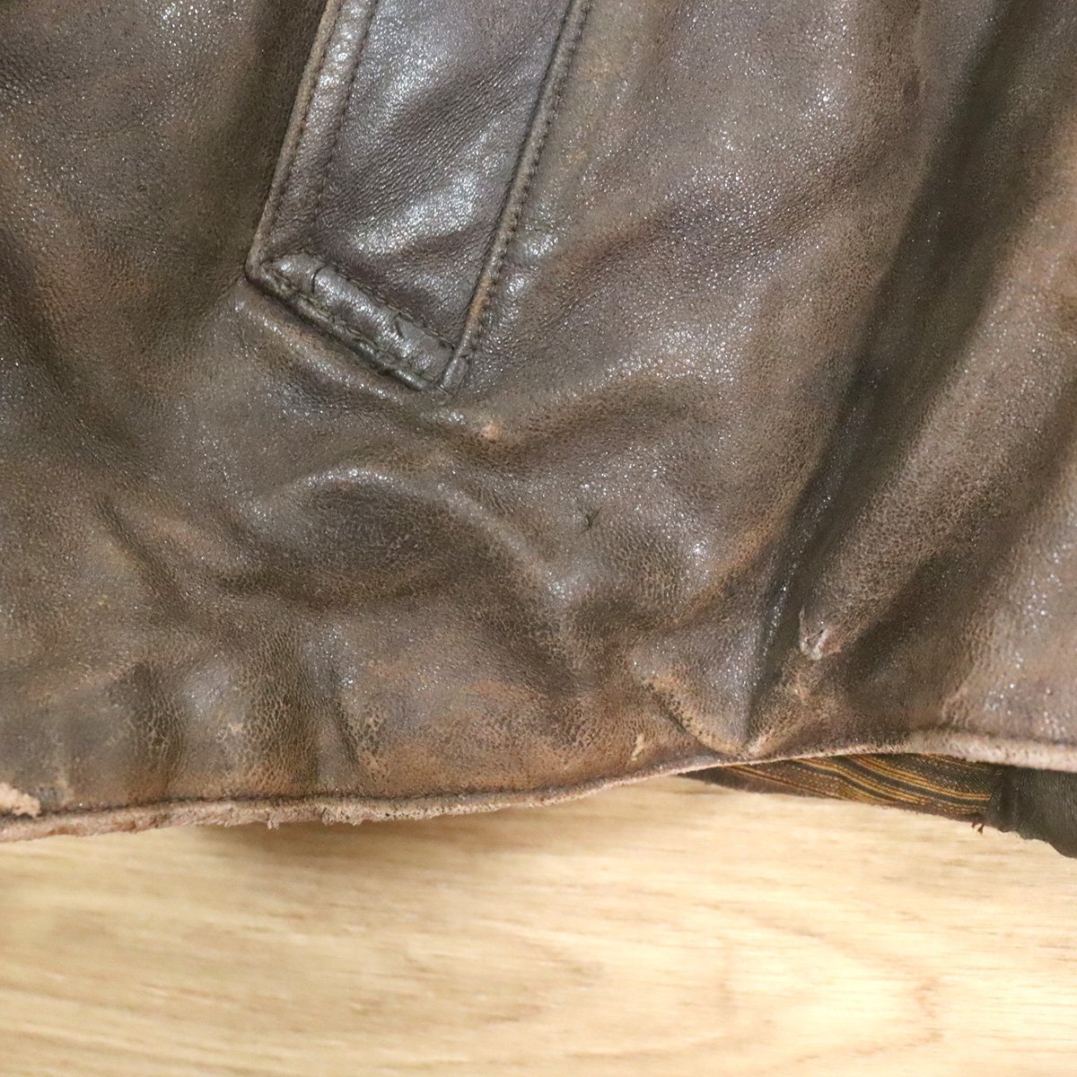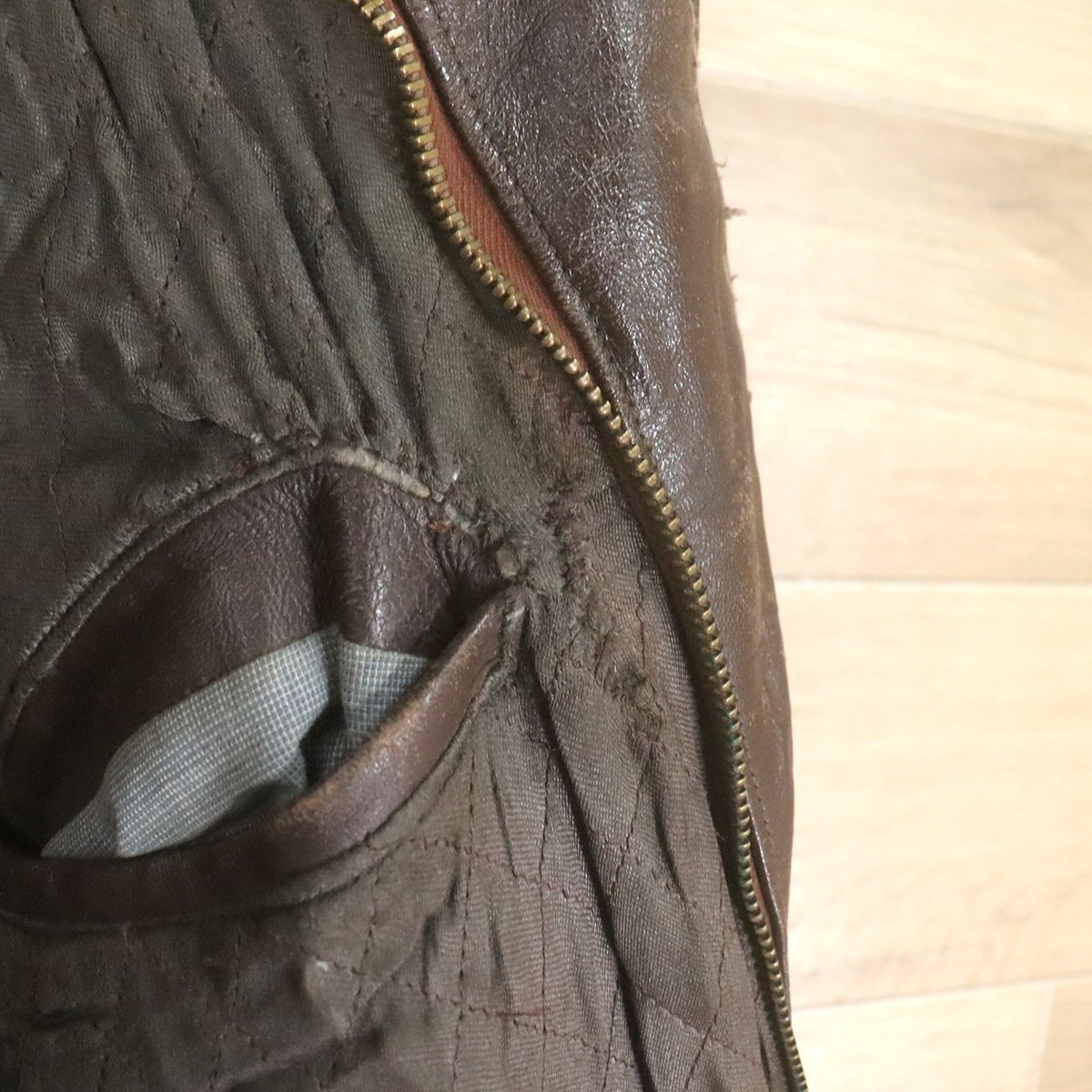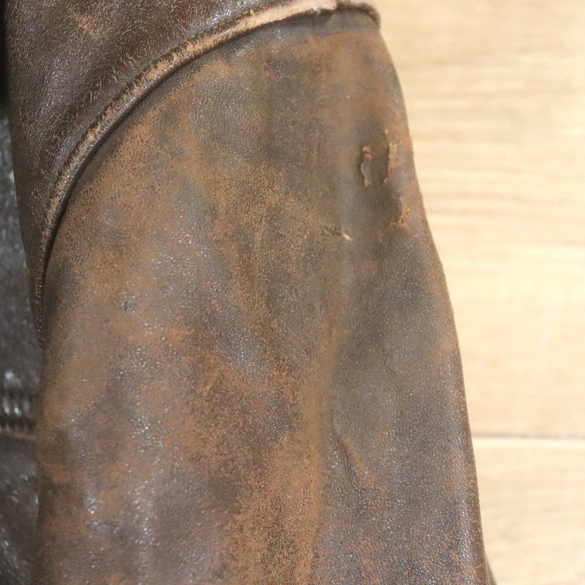 中古品です。使用感があります。全体的にレザー特有の色褪せ、擦れ、擦り切れがあります。裏地にも擦り切れが見られます。右袖先のアジャスターのボタン、襟のボア部分のボタンが付け替えてあります。ライナーは付いていません。